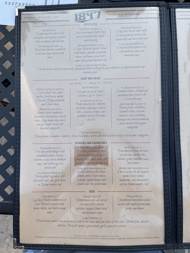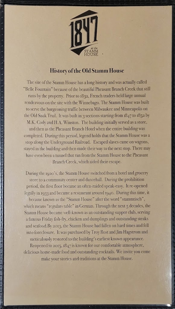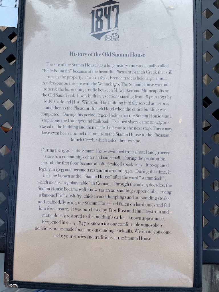 This place is OG Wisconsin. Come here for the fish fry and the classic old fashioned cocktail, but stay for the French onion soup and the sirloin. And while you're at it, read the back of the menu to learn how this building was once an important stop on the underground railroad, along with other interesting historical facts. Thanks for being one of my best meals in Wisconsin, a real Stammtisch!