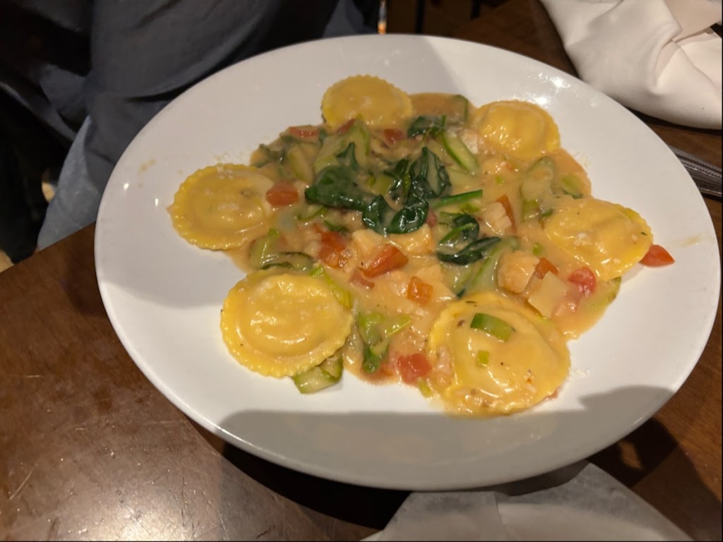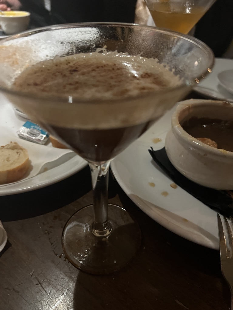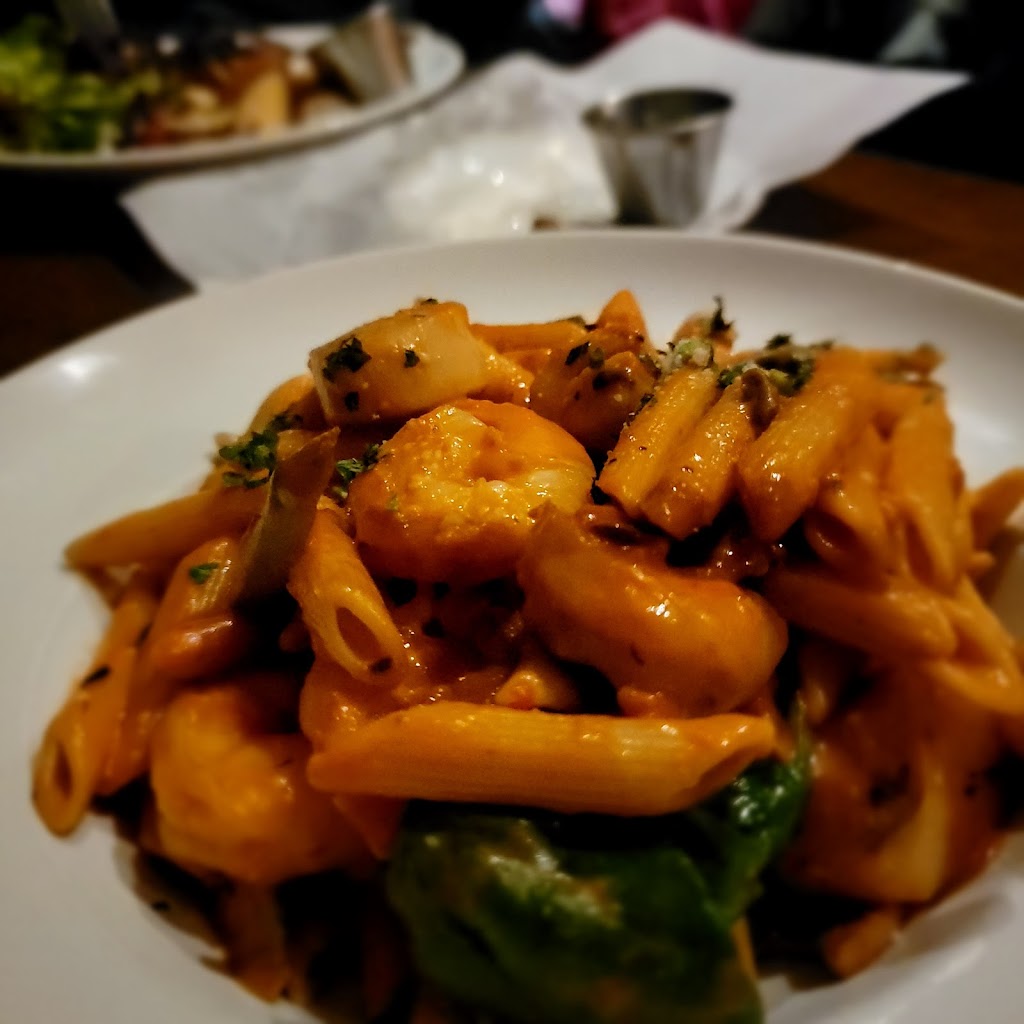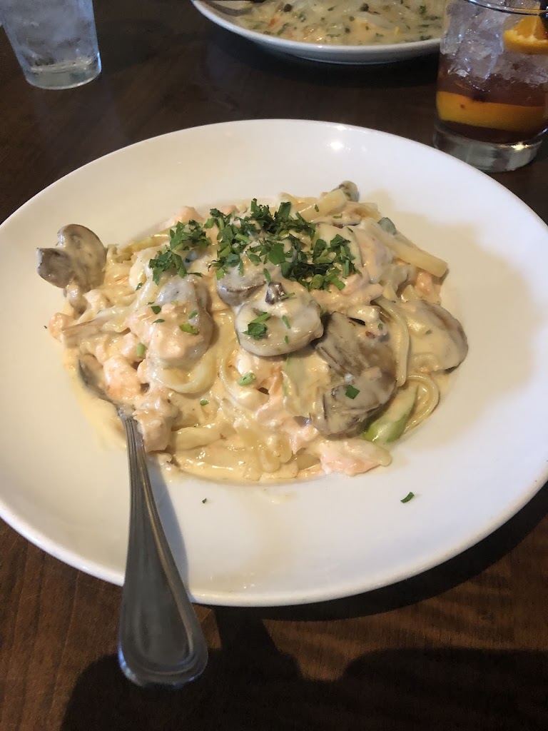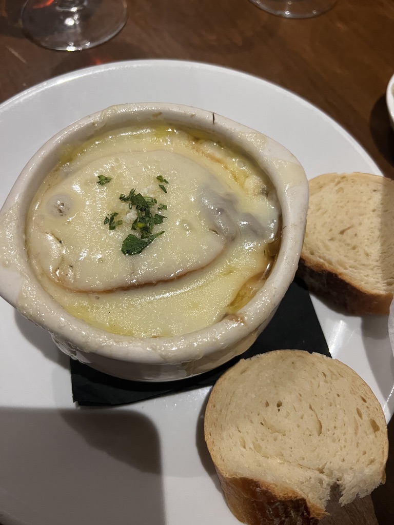 Best French onion soup ever. Seafood and pasta was cooked great. The sauce lacked flavor and was loose. The waitress was pleasant but very new and struggled a tad.