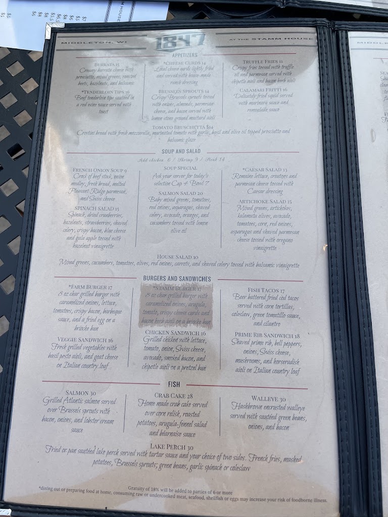 독일 스타일의 음식을 파는 tavern 느낌 식당이다. 음식들이 무난하게 맛있다. 식당과 이 건물의 역사가 매우 깊다고 하는데 그래서 괜히 기대가 높아졌다. 음식은 그냥 맛있는데 다른곳들보다 더 특별하거나 고급스러운 느낌은 아니다. fish fry는 양도 꽤 되고 같이 나오는 시금치가 좋았다. 아내가 먹은 독일식 버섯크림파스타는 맛있는데 간이 조금 세고 자극적이었다. 그냥 동네 펍 간다는 마음가짐으로 가면 만족할 수 있을것 같다. 다만 가격은 좀 쎄다고 느꼈다.