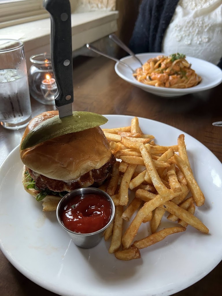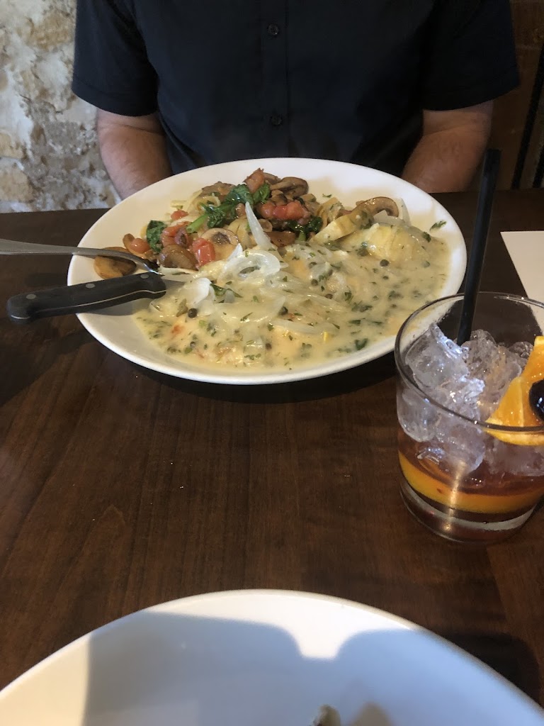 Went to dinner with a friend. We had two appetizers, truffle fries, which came with two dipping sauces. We also had beets that came with garlic toast rounds and goat cheese. She had the Beef Stroganoff. The noodles had a nice bite, and the beef tenderloin pieces were tender and sized for a good bite. The stroganoff had bell peppers, porcini mushrooms, and onions. The sauce was the right consistency. I had the seafood fettuccine. It included clams, mussels, shrimp, and scallops. The fettuccine has a white wine garlic butter sauce with tomatoes, spinach, and some chili flakes, which added a pleasent bit of heat to the dish. We had Tiramissu (the coffee in the lady fingers could be tasted) and Creme Brulee for dessert. The desserts were very good, and both of them included berries with a bit of berry sauce. I had a Blood Orange sour, and she had a Stamm Mule. Both drinks were well prepared and tasted good. My friend was having trouble with one of her legs, so we sat on the first floor. We hope to have a seat in the main dining room upstairs on our next visit. Some people were enjoying the patio experience. We were unaware of the patio option seating and did not have a light jacket along, so we decided to stay inside to prevent a chill from the nice but slightly chilling weather. We look forward to our next visit. There is plenty of parking behind the restaurant. If you have trouble walking? You may want to have your driver deliver you closer to the entrance. There is handicap parking available.