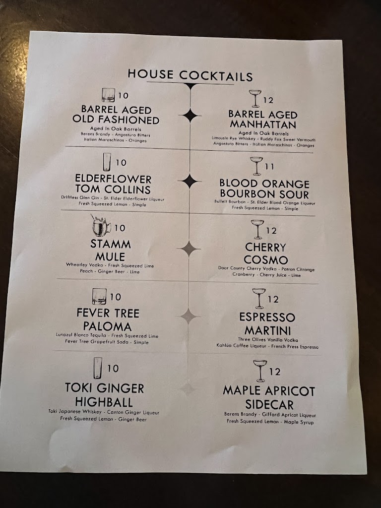 Cozy atmosphere. Family friendly to my wife, myself, and our 15 month old. Wonderful cocktails. One of the best ribeyes in Madison!