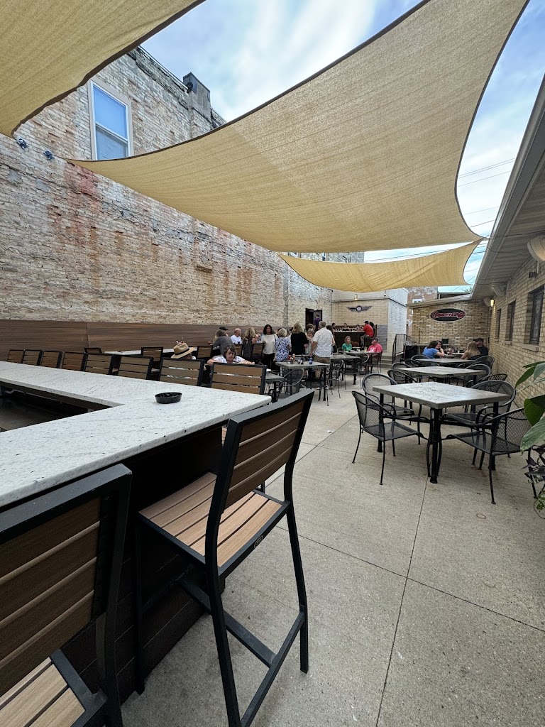 The atmosphere on the open air deck is really nice. Cream city brick and nice tables. Food is really good and have a few healthy options for people who sm don't just want to eat burgers with fries when eating out.
