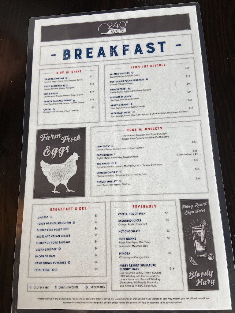 We stayed the weekend at The Abbey Resort. Did the breakfast buffet at 240 West both days as well as the prime rib dinner special Saturday night. The food was fantastic and the service was awesome. Especially, Jack, who was our server Saturday morning. Extremely friendly, professional and keeps you smiling with an occasional joke. Another treat, was getting randomly selected for a couple of homemade holiday pies from John, Saturday night. Nothing like surprise pies. We definitely will be back.