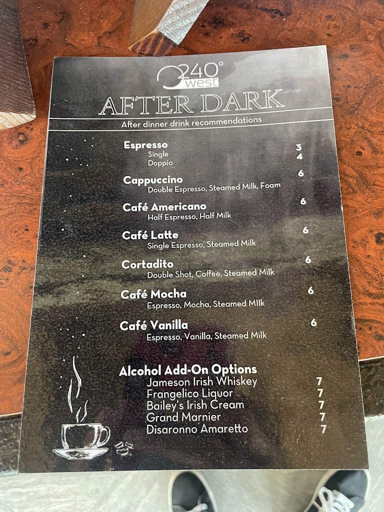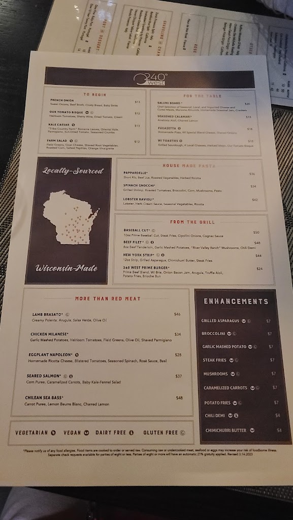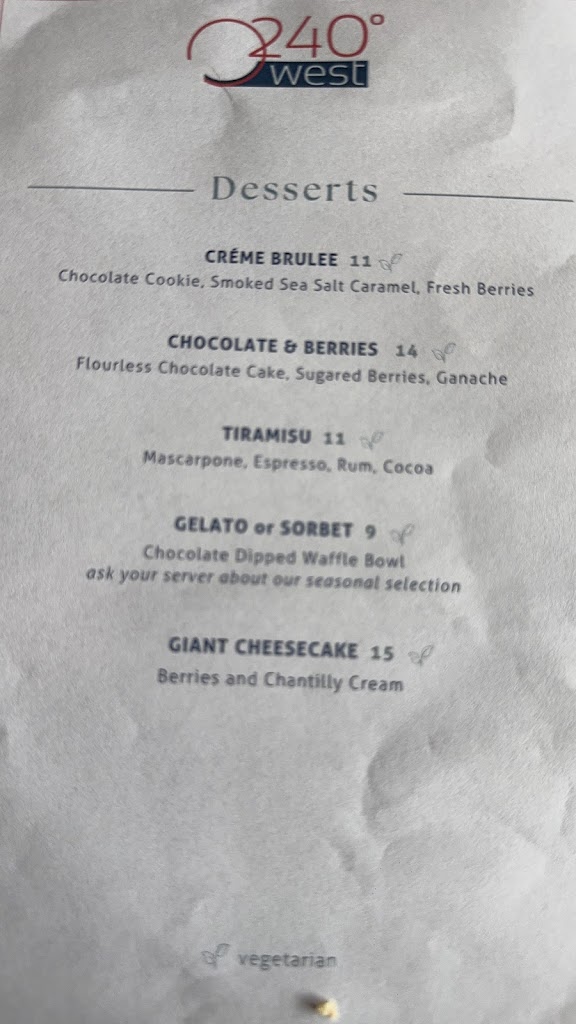 At 240° West, we look forward to giving you an exceptional dining experience from beginning to end.