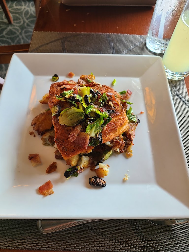 The convenience of a restaurant onsite is certainly an advantage. Wish the meal lived up to the nice ambiance of the restaurant/views. We had the duck entrée and chicken/shrimp gnocchi. Although the duck was okay the shrimp and chicken gnocchi were extremely salty. It felt as though the shrimp and chicken had soaked in salt water for days. Our appetizer was the popcorn cauliflower. Was tasty and a light appetizer before dinner. Slightly overbuttered but still good. Service from 'Jack' was very good and memorable- thank you! Live music was a nice touch [pianist playing]. For seating- would recommend sitting either next to fireplace or near window.