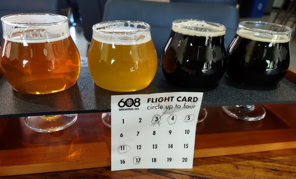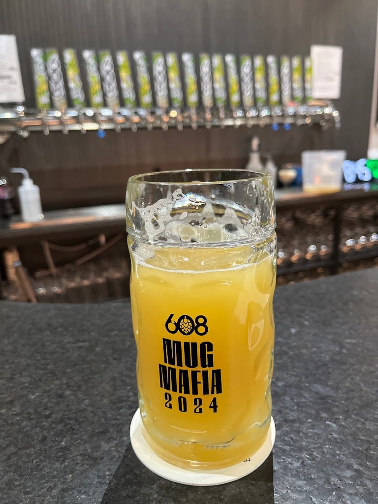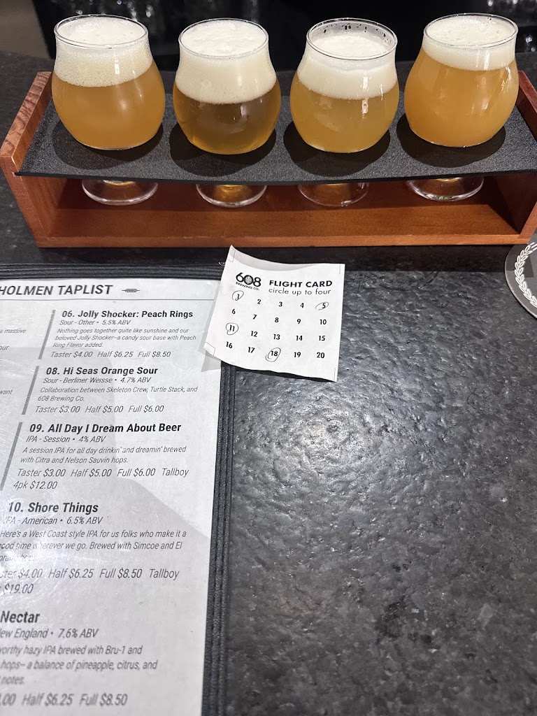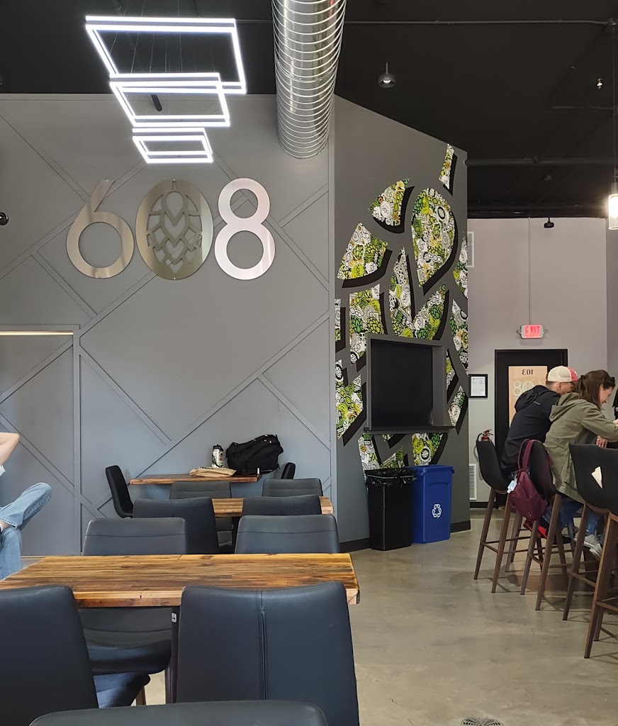 I really like sours and seltzers and there are always a few options to try. My favorites right now are Fixed and Forsaken and Low Hangin Loot. 608 also has a nice size menu to order anything from appetizers to sandwiches. Comfortable seats and a beautiful outdoor space for when the weather is warm too!