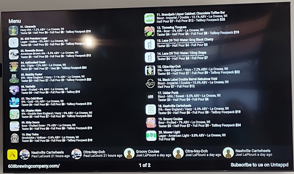 This place is awesome! Holmen had 0 bars/breweries/craft beer locations worth traveling for-now they do. The vibe is great, the beer is great, the location is great. If you want good beer, go to 608. The service is great and the beertenders are not only friendly, they’re personable. Check out the upstairs lounge for a different setting. Huge TVs everywhere, a patio, food trucks and on-site kitchen coming soon, 608 Brewing can’t miss! Long time caller, first time on-air: I very much enjoy good craft beer-trust me on this one.