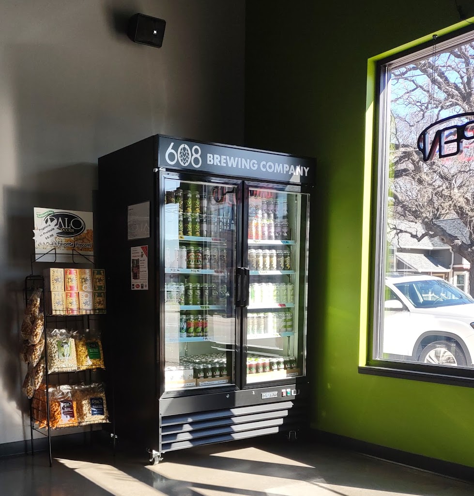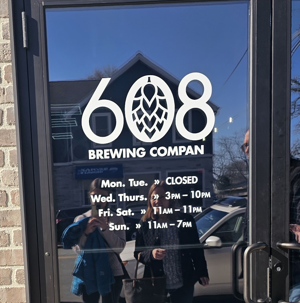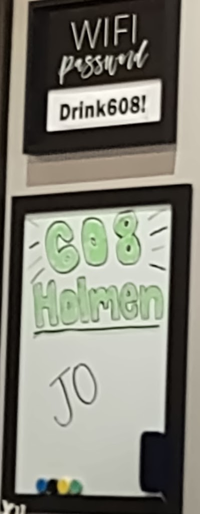 Inaugural visit Thursday. Easy street parking....there weren't many cars compared to people inside so I get the vibe this is the neighborhood wearing hole... which adds charm. Welcoming, spacious digs....complete w all standard height tables! The bar has higher chairs. Looking at the bar I'd venture a guess it's made from barrels...cool concept. After I asked my beertender her name I continued to glance around... noticing a whiteboard w her name on it... thanks. It was posted below the tap room wifi Info... again, thanks, appreciate not having to flag down a staff to ask. Merch is displayed in the NE corner by the door out to restrooms. Look up....some cool light fixtures. I liked the hop mural on the north wall and the various silver 608 logos. The to-go cooler is in the SE corner....away from any seating so you don't have to work around anyone just to get your beer! Next to it is the snack options. Glancing around... I noticed a garage door and beyond that a picnic table or two outside. Good to know for the Summer months. Beertender Jo was friendly and helpful in building my flight. The prices are all listed but I felt a little gouged at the flight prices....even if it's a BIG beer $5 is a little steep for a 4 or 5oz pour. That was the only part of my experience that left a...no pun intended... bad taste in my mouth. Otherwise the prices seemed on point and I was appreciative that half pours are an option! The tap list is displayed on the tv's hanging behind the bar. The beer is Brewed at the La Crosse brewery and brought over which makes sense so the two locations are so close. This is a great little tap room w lots of big windows for natural light and it's cute how it's just nestled in to an unassuming location. Thanks 608.