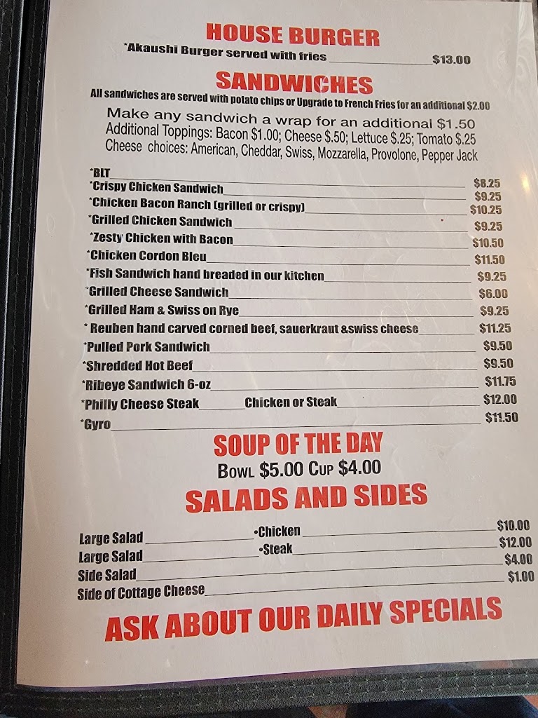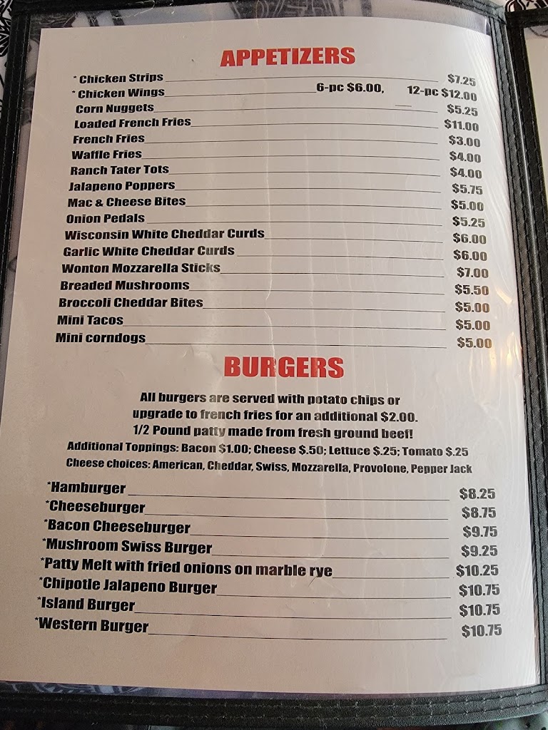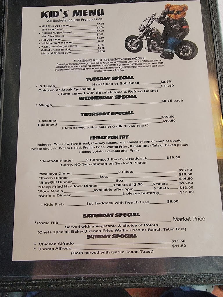 A family friendly unique atmosphere! More than your average place! Friday fish fry. Saturday prime rib, and daily specials that are constantly changing!