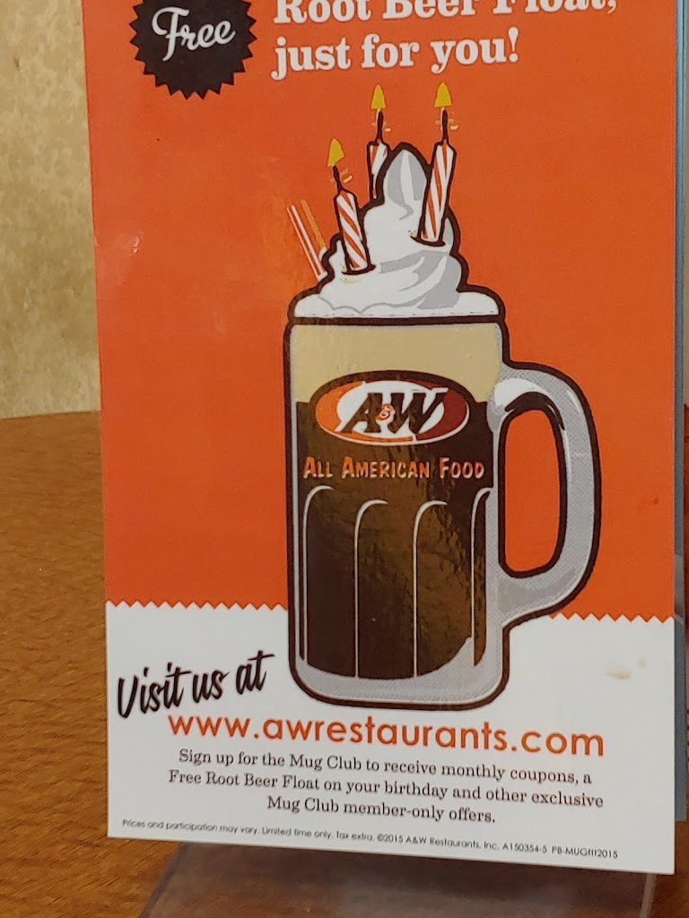 I ordered the Monday special-a hamburger, fries and a drink for $2.99! I asked for the burger to be well done and was told the burgers are timed so no one receives an unsafe burger. My burger was well done and very tasty. The fries were hot and plentiful, and the root beer was sweet and cold in the glass mug. They have daily specials listed on a board near the window, so you always see what the deal is before you look at the main menu. I will eat at A&W again!