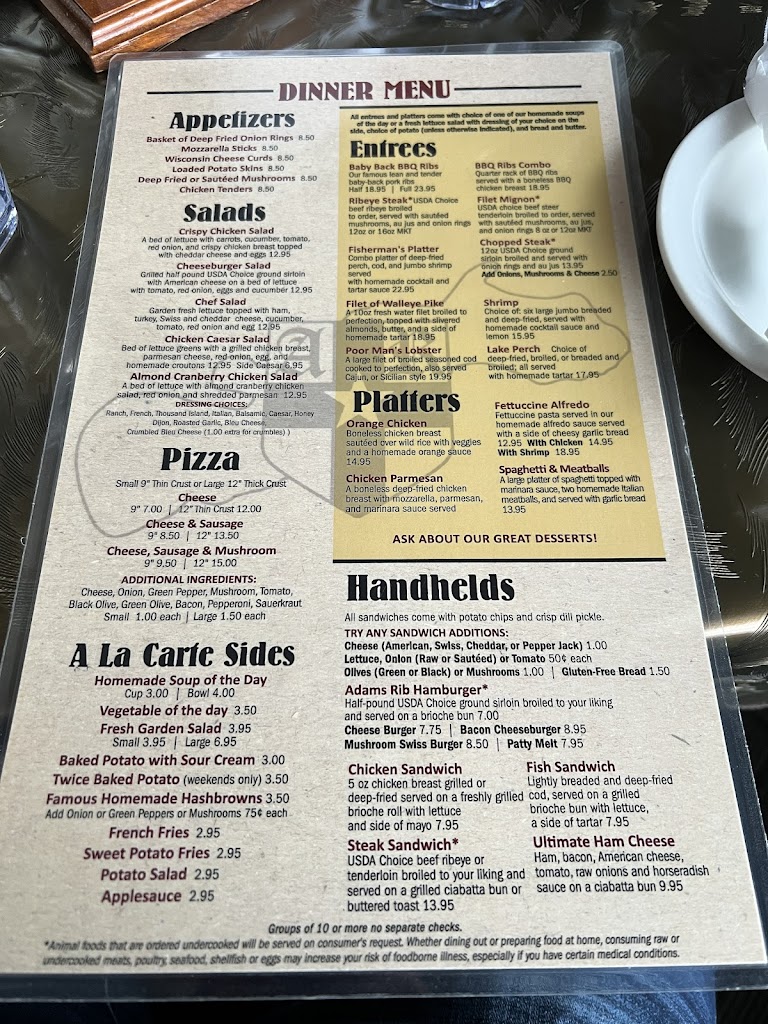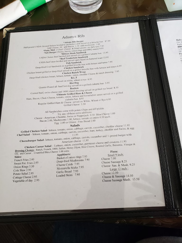 Last week four of my family capped off a great week in Green Lake by dining out. We enjoyed dinner at Adam's Rib. I had the large ribeye - excellent. My wife had grilled Walleye, also excellent. My daughter had a filet mignon, and was disappointed. My son-in-law had a half rack of ribs, and it too was very good. Prices were fair. Our waitress was very helpful and provided us excellent service. Bottom line, I heartly recommend Adam's Rib for a home town dining experience.