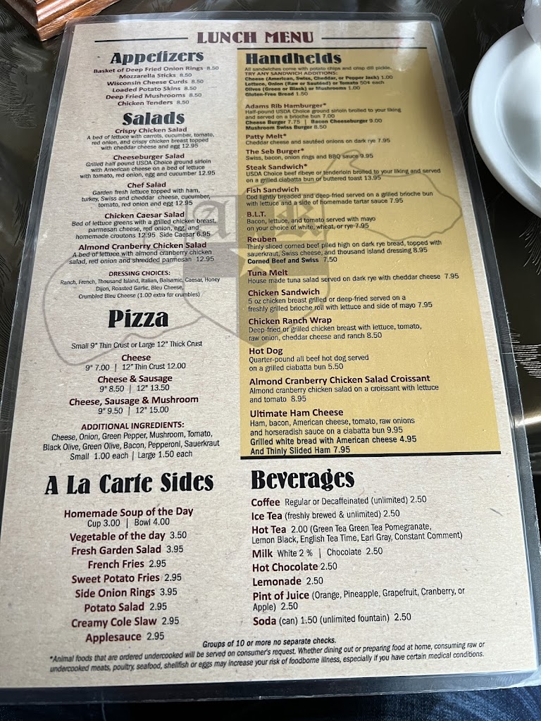 If I could give no stars I would. Never went here, but was in town for the harvest festival and decided on lunch. So we sat down and asked for menus,well it was a limited menu offered. Basically couple items that’s it. So we order cheeseburgers, I asked if fries came and they said no, bag of potato chips. Wasn’t super turned on,but ordered cheeseburgers. We got the burgers and the small potato chip bag. The burgers were not cooked enough, they were still raw inside. They were also smoked, super gross. Anyhow, no one checked back to ask about our food, we did not eat it, the bill was not compensated when we showed them, the wait staff argued about it claiming it was cooked prior to being served,which means it was reheated food that was undercooked and sat in its bacteria. We paid the full bill, didn’t eat anything and left. I think this was a money grab because of the fall harvest event, they took advantage and didn’t care. I would never go back here. First time and the last time.
