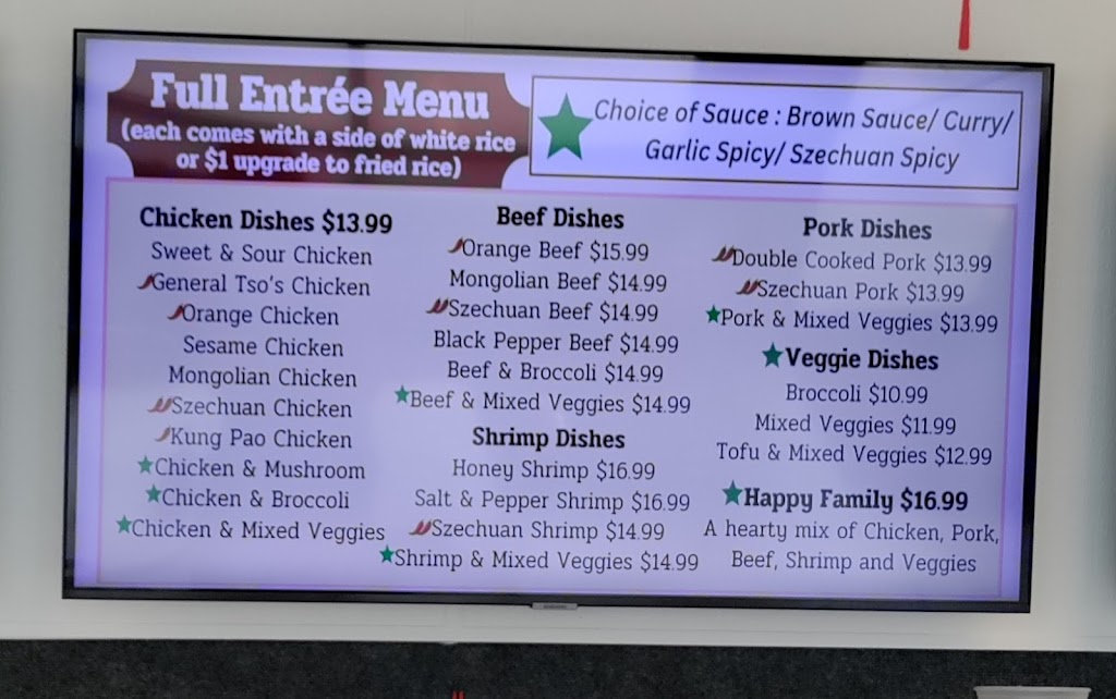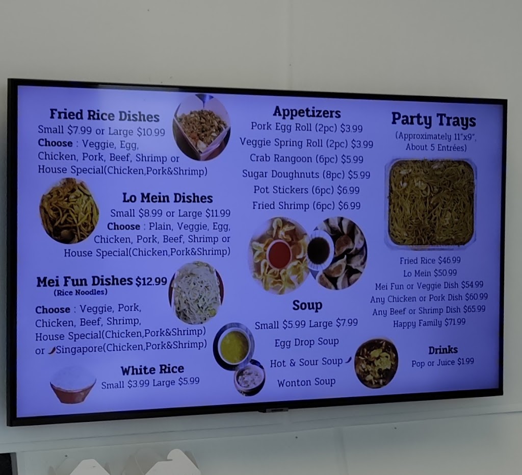 We told several times to make sure and reminded that not to mess up that we want fried rice without eggs, but when we took the food, it had eggs in it. It was a carry out so we did not check, but later when we opened it had eggs in it. Unfortunately we had to throw the food and had to get something else from some where.