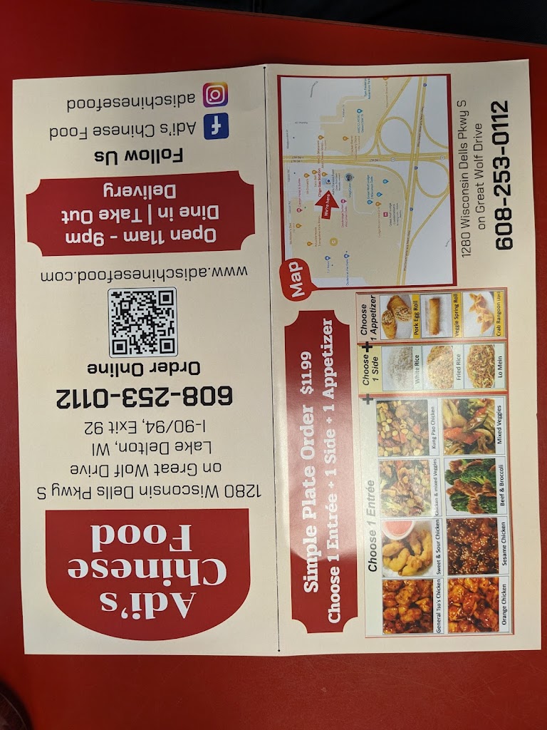 I forgot to write a review from my Mother’s Day weekend in the Dells. I come from the San Francisco Bay Area where we have GREAT Chinese food. I am always hesitant to buy Chinese food in Minnesota (where I currently live) because it usually is nasty or mediocre. When I walked into Adi’s there was a Caucasian man (a worker) and my hopes had went down because I’m used to Chinese establishments. I knew that my money would be wasted. My prejudice took over. When I got back to my room and I slowly made my plate. Omg, the aroma smelled good so I started to feel better. OMG, the food was sooooooo GOOD. It tasted like the Chinese food from the Bay Area. I contemplated on ordering more from my trip back to Minnesota but did not have enough time. The best Chinese food that I’ve had in the Midwest so far. I will always eat here while passing through to Illinois. I DEFINITELY RECOMMEND!!!