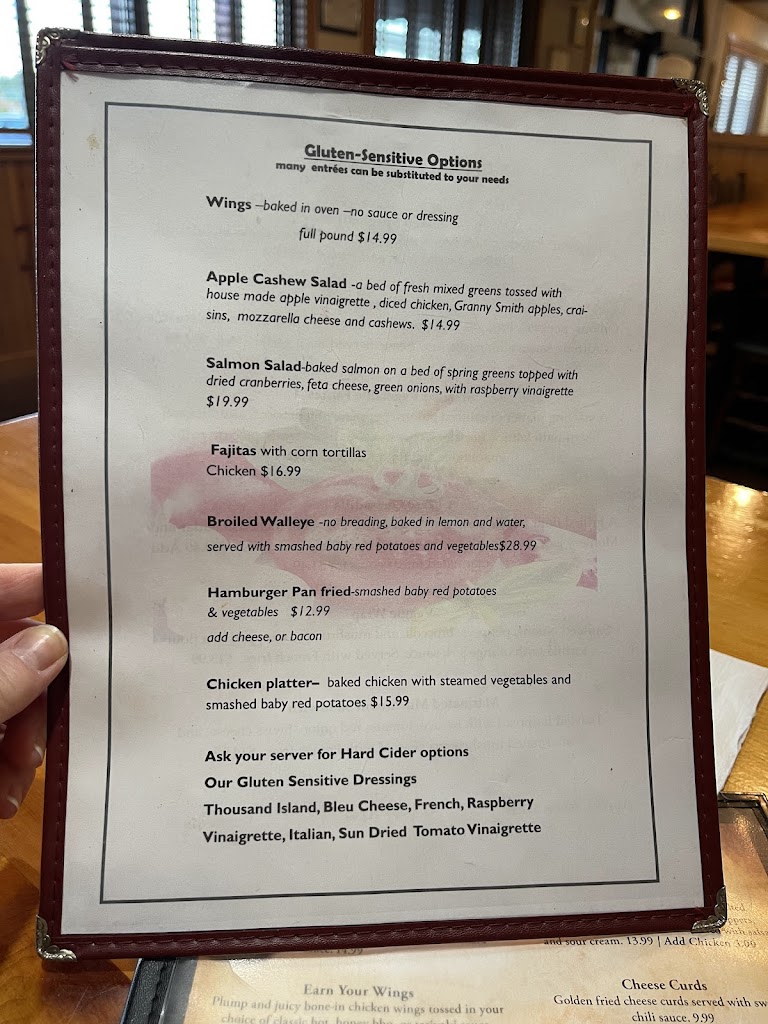 Oh my gosh - YUM! I am gluten and dairy free. Our waitress, Chris was awesome. Helping me find something delicious. They have a gluten free/sensitive menu. I had the ribs with rice, pilaf, and broccoli. I skipped the sauce, just in case. The ribs were cooked so perfectly. The meat fell off the bone and melted in your mouth. My partner had the salmon salad, which was also on the gluten-free menu and it was absolutely delicious! Highly recommend this place. The waitress Chris really helped make sure I had gluten and dairy free food.
