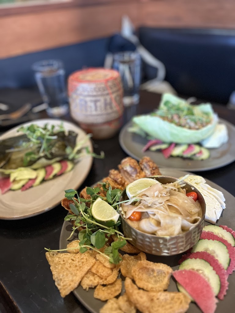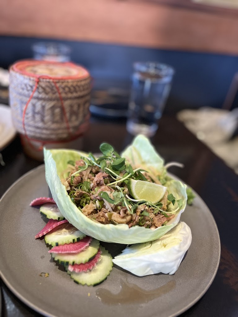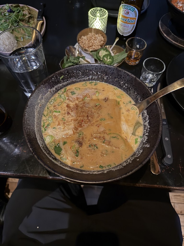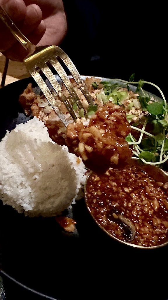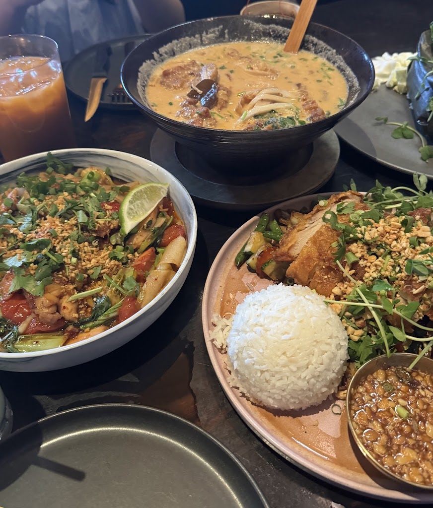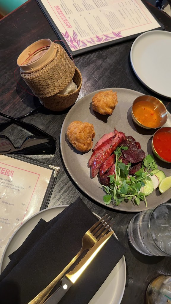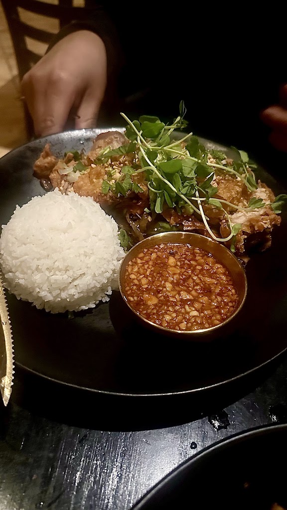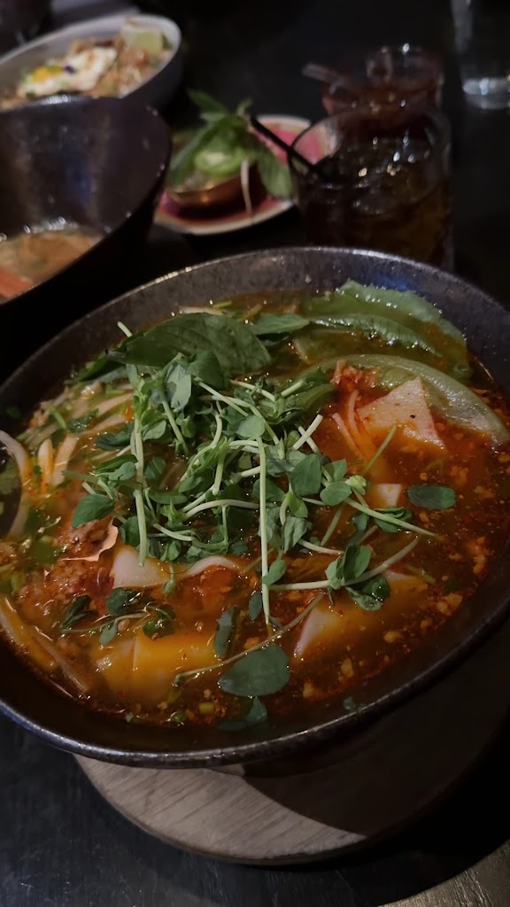 Fire experience, both in terms of food and service. 🔥 I don't even have photos of the food to post because I ate it so fast. We got the laotian snacks and chevre wontons to start and they were transformative (the laotian sausage was insane). Then I ordered the laap nuea which was so good with a touch of fresh chilis and chili oil (so refreshing with the raw veg on the side and sticky rice). My partner got the praram long song with the fried lemongrass chicken (so good and crispy). My friend got khao poon kathi dang (red curry coconut noodle soup) and said she was changed after that experience. The chili oil and jeow som were so good I took some home with my leftovers. We ended up sharing a little of everything because it was so good. Also their cocktails are fab, a couple highlights are their pho spiced coffee martini, beekeeper (forgot the name but honey themed), and then the calpico cocktail (also forgot name). We loved our server, Jacob!! He even gave us a orange jasmine ice cream on the house just cause ✨