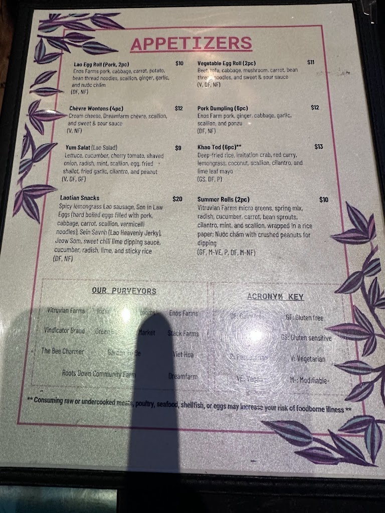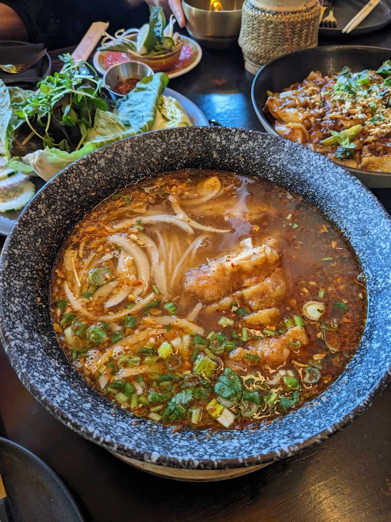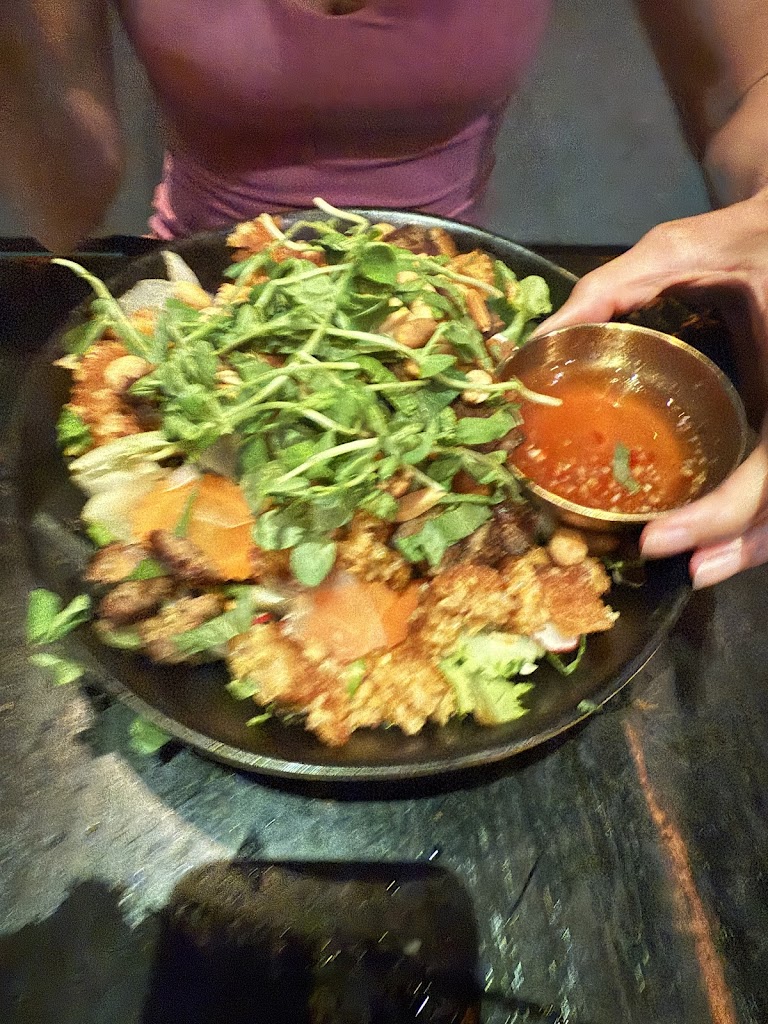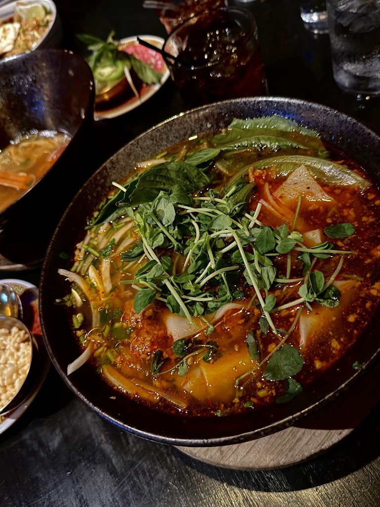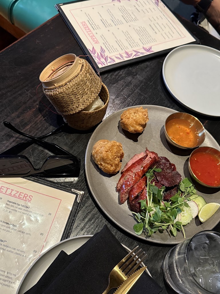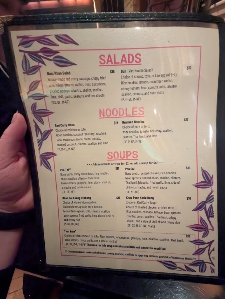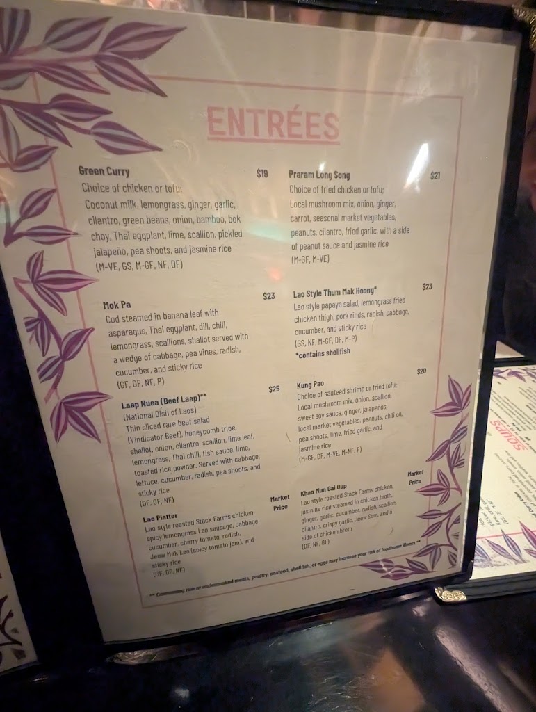 Fire experience, both in terms of food and service. 🔥 I don't even have photos of the food to post because I ate it so fast. We got the laotian snacks and chevre wontons to start and they were transformative (the laotian sausage was insane). Then I ordered the laap nuea which was so good with a touch of fresh chilis and chili oil (so refreshing with the raw veg on the side and sticky rice). My partner got the praram long song with the fried lemongrass chicken (so good and crispy). My friend got khao poon kathi dang (red curry coconut noodle soup) and said she was changed after that experience. The chili oil and jeow som were so good I took some home with my leftovers. We ended up sharing a little of everything because it was so good. Also their cocktails are fab, a couple highlights are their pho spiced coffee martini, beekeeper (forgot the name but honey themed), and then the calpico cocktail (also forgot name). We loved our server, Jacob!! He even gave us a orange jasmine ice cream on the house just cause ✨