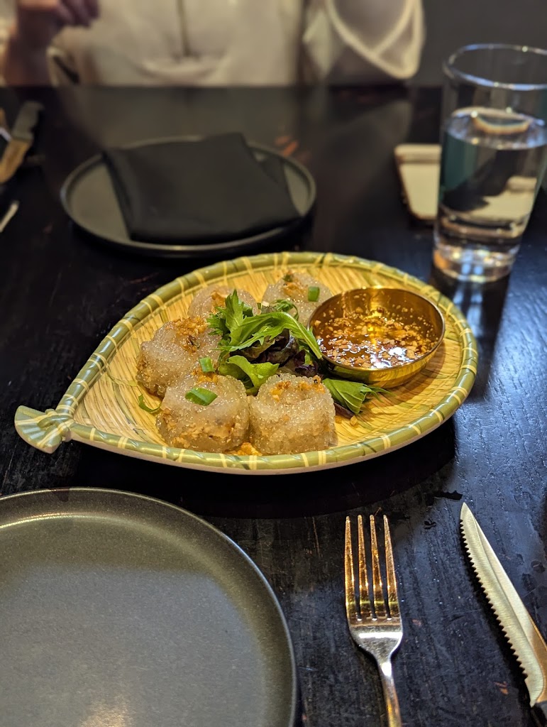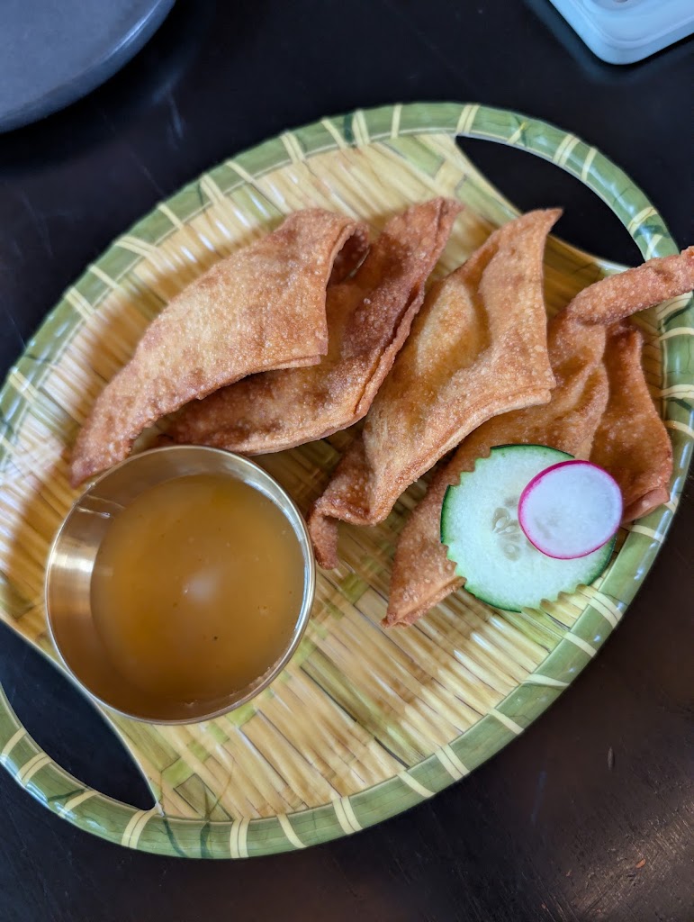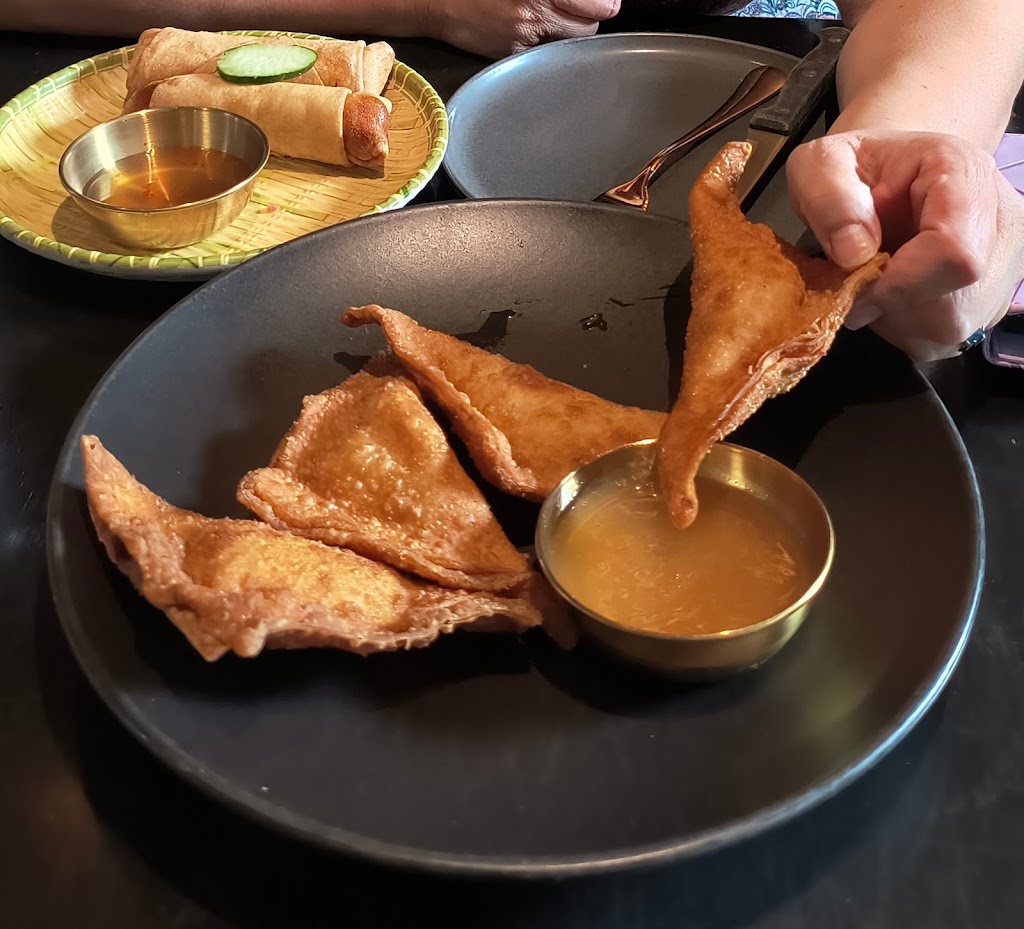 We enjoyed the Lao egg rolls, fried but still delicately crispy. They were filled with pork, veg, and noodles, accompanied with a nicely balanced and light dipping sauce. The chevre wontons with their own sweet and sour sauce were decent but could've used more scallion in the filling.
