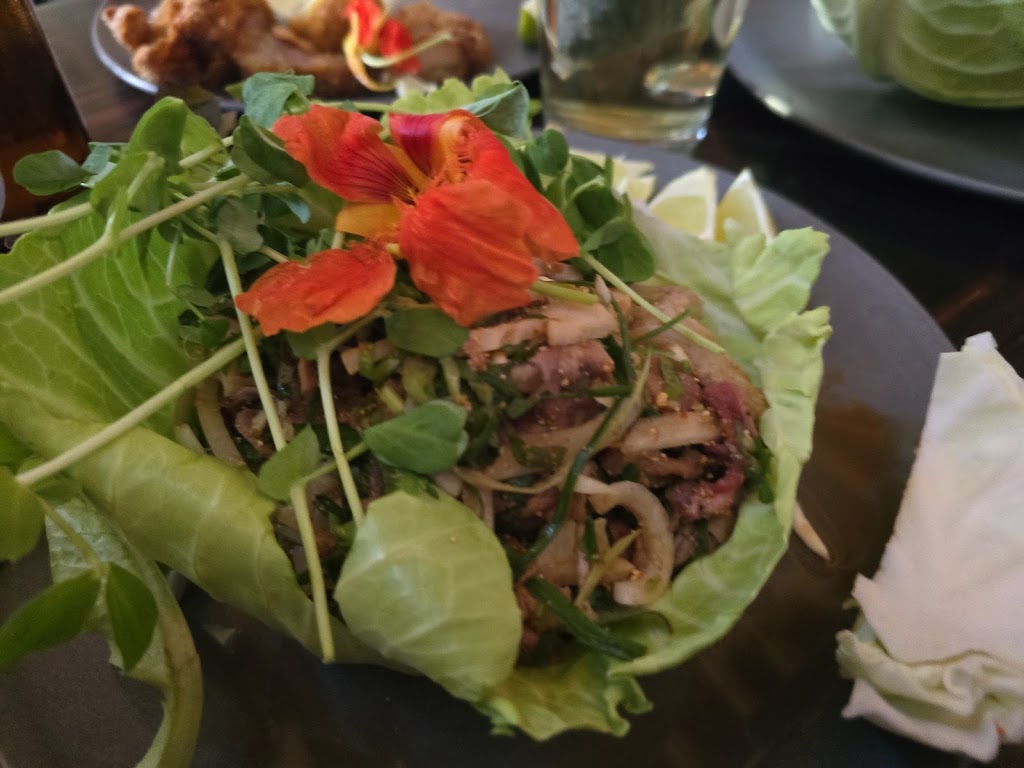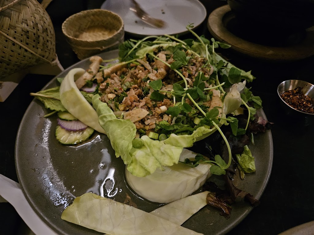 We shared a main course, the National dish of Laos. The beef laap was tender and nicely seasoned but I would have liked the dish less dry. It was served with a wedge? of cabbage, lettuce leaves, a few radish and cucumber slices. No sauce. It didn’t wow me.