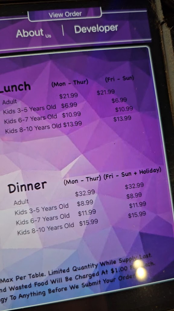 This is great ayce for families with children the staff was really nice and the food was on point the whole night. I keep getting the sashimi while my family did the rolls and other fried foods like tempura shrimp. The hibachi options are nice too the steak was