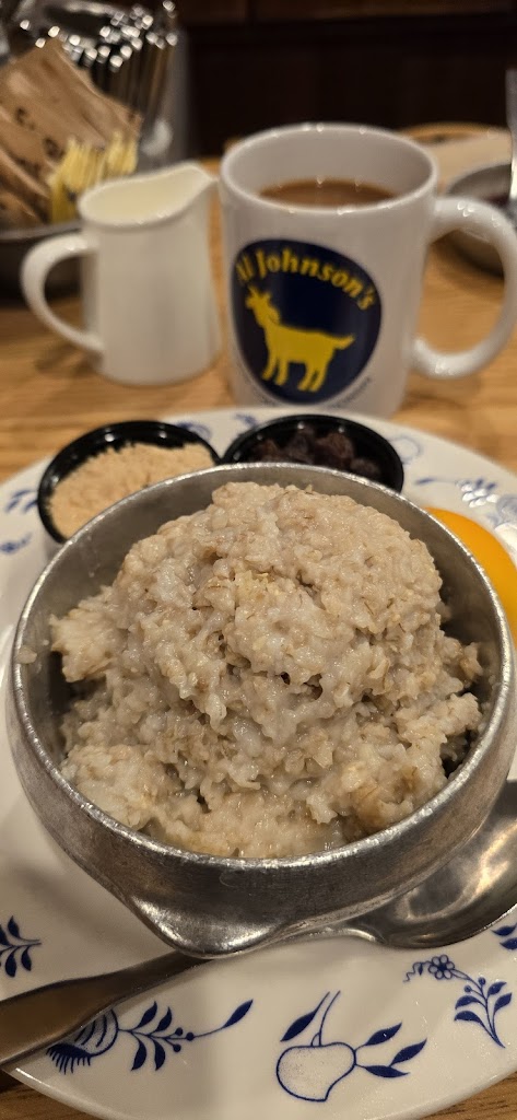 The food is delicious and satisfying. The oatmeal is a generous serving of chewy grain with raisins, brown sugar, and cream, a meal in itself, but also a good introduction for the rest of your breakfast. It is aailable until noon, but if you are there just past noon, you should be able to get some.