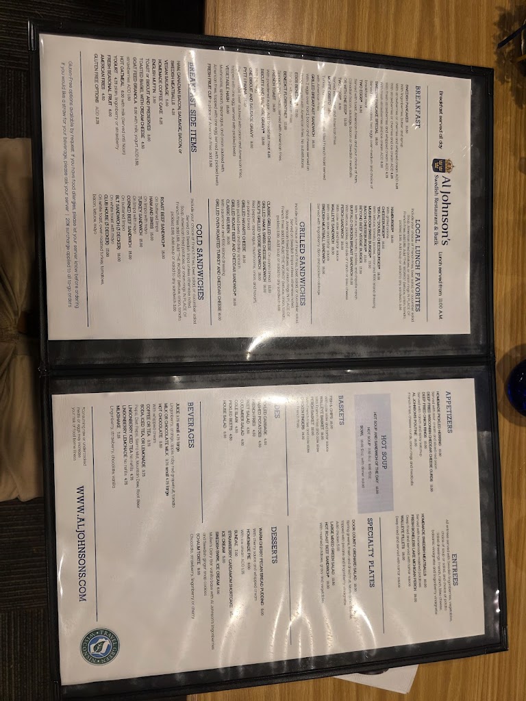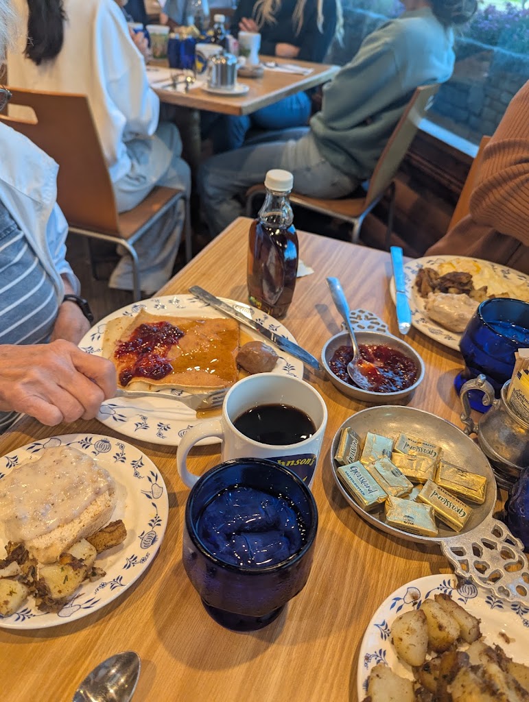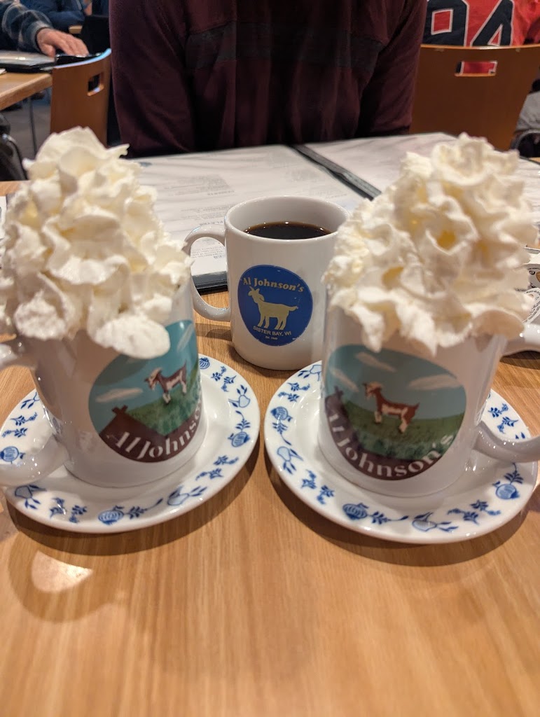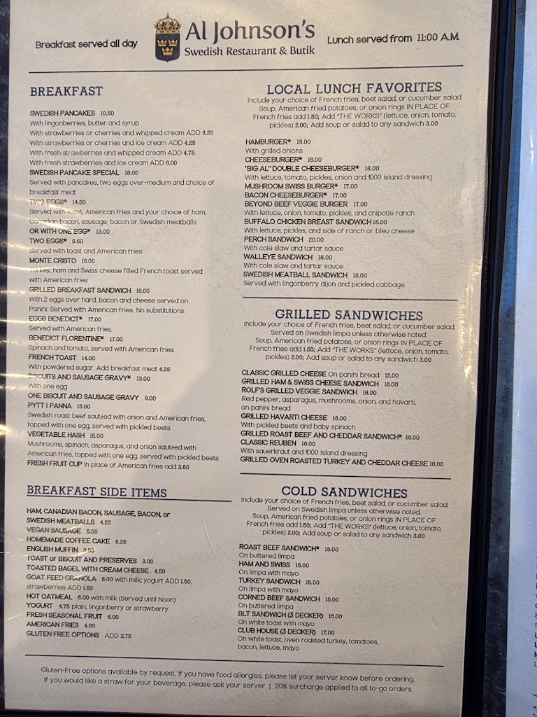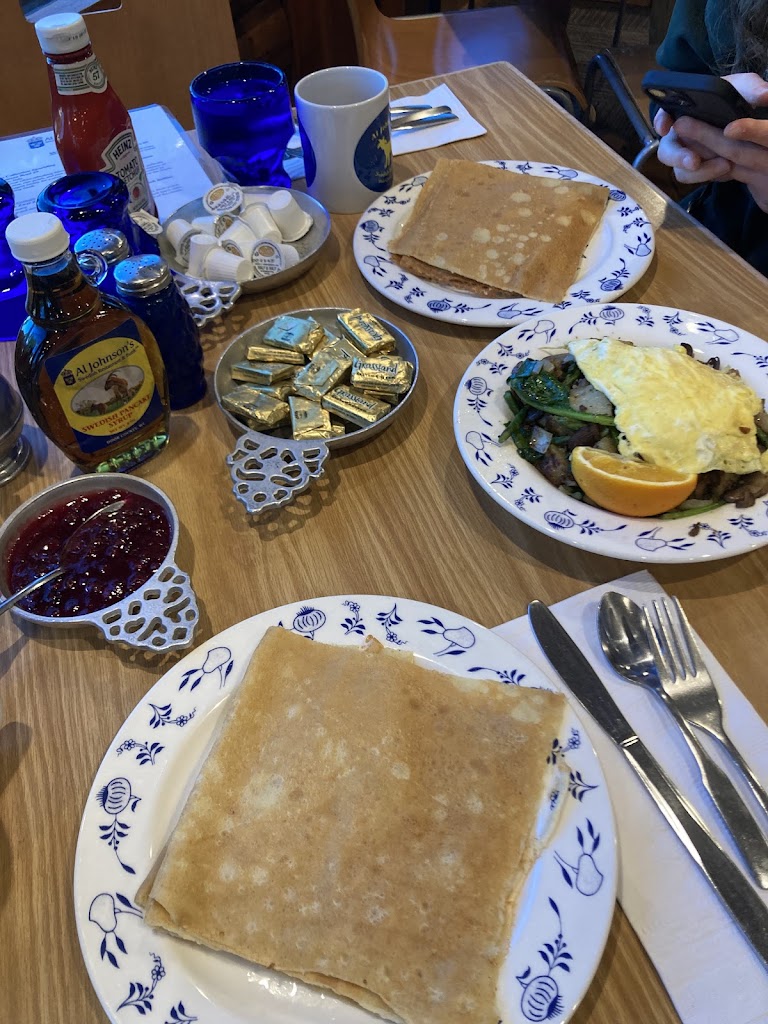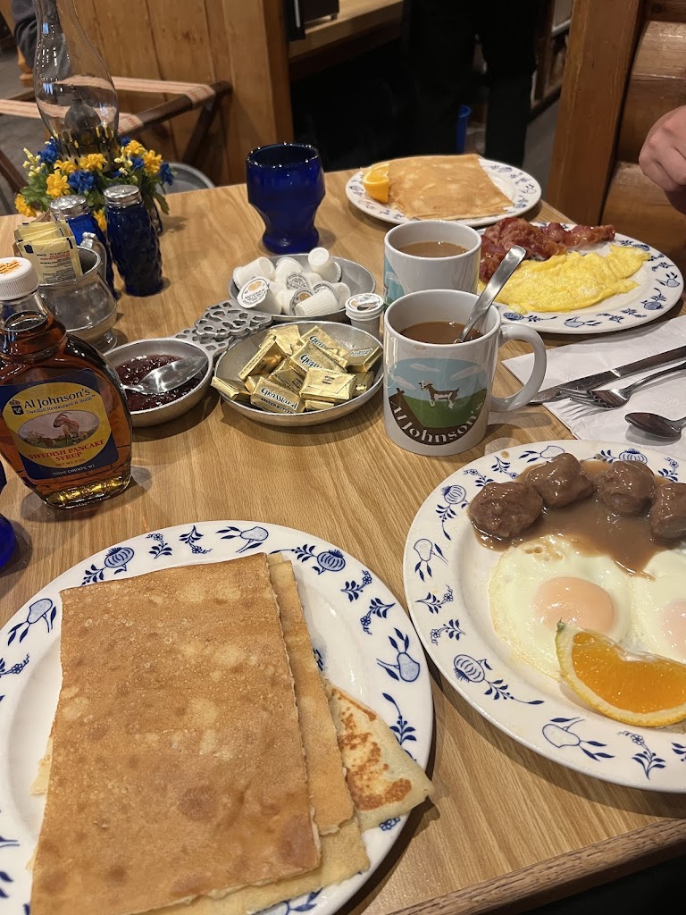 2023 review: Al Johnson’s was a super fun breakfast dining experience for my family! The Swedish pancakes were delicious, (four in a serving)! We had a beautiful view of Sister Bay from our corner window booth. Our waitress was very efficient and friendly; happily and quickly getting everything we requested. I loved the restaurant’s Swedish decor and the adjacent gift shop was packed with interesting items to purchase! The goats grazing on the grass roof were charming too! ❤️