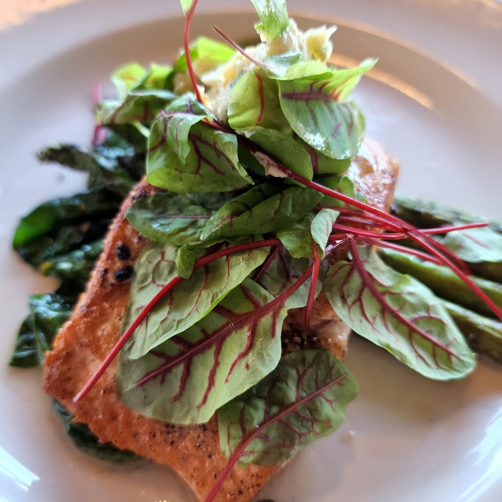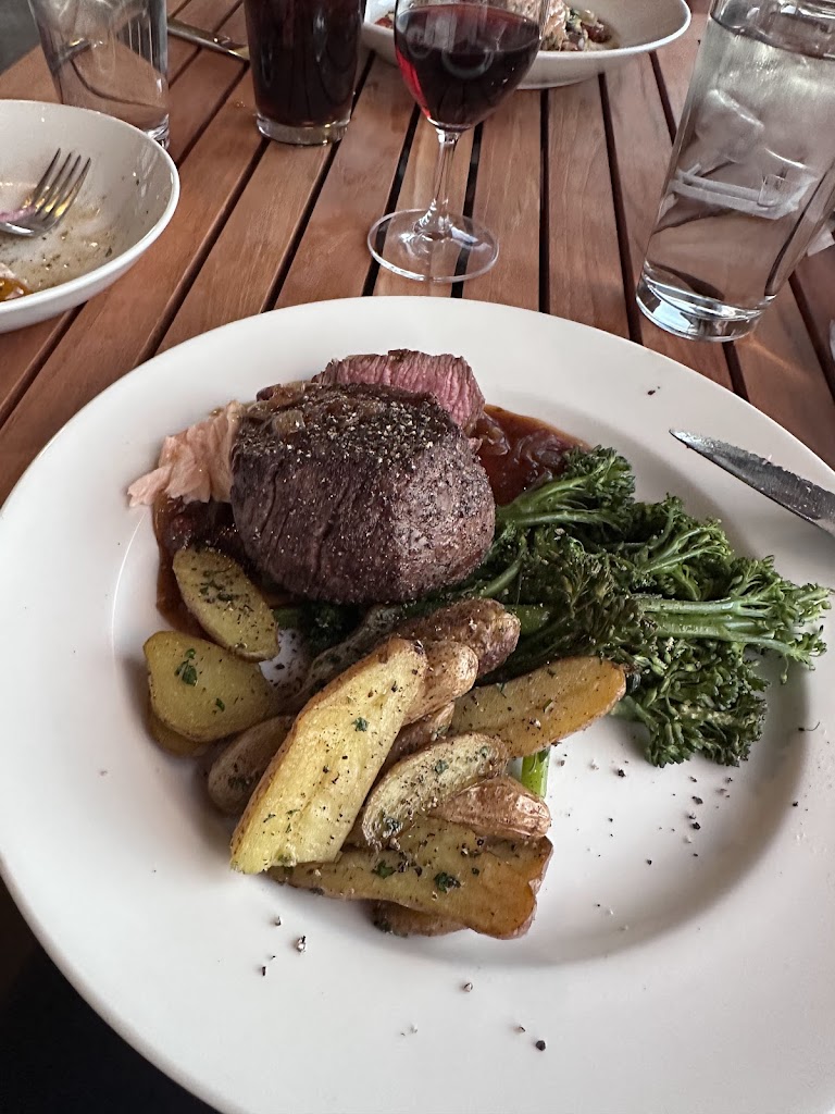 Cons: limited, generic, and fairly pricey menu. We shared crab cakes, and got salmon + the ny strip with asparagus and smashed potatoes as sides. Main courses were both a touch over, and the kitchen seemed especially heavy handed with the salt and black pepper across the board - and this is the first restaurant I've ever complained about over salting. And then, a $150 bill for 2 people: pre-tip, no booze, and no desserts ,