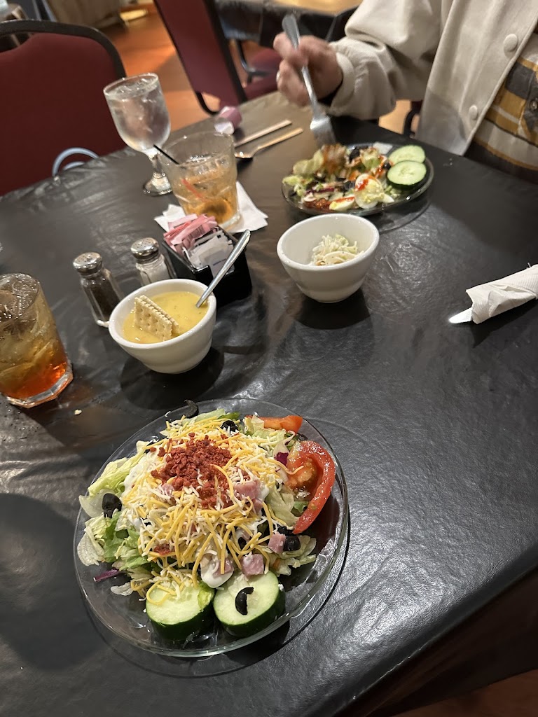 The service was great. Our server was very attentive and check on us a few times. However the food was not great. We got the seafood buffet and almost everything was luke warm, and was not the quality was not great. Someone in our group got a cheeseburger and it was very mushy. It almost seemed like it was all fat and no real meat. The salad bar was a good part to the buffet, it had a large variety of different toppings and many different salad dressings along with 2 different soup. Overall I would not recommend getting the seafood buffet, but maybe try something else on the menu, and add the salad bar.