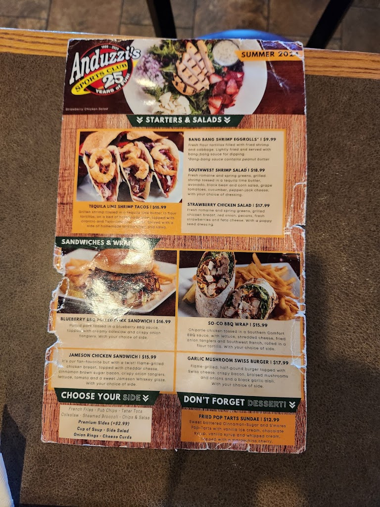We ended up closing our tab for the one drink my fiancé ordered. We ended up going another restaurant, The Bar, instead. The Bar had better service, more foot traffic, and the food was way better compared how I remember it being at Anduzzis. Im so happy we ended up taking our business elsewhere.