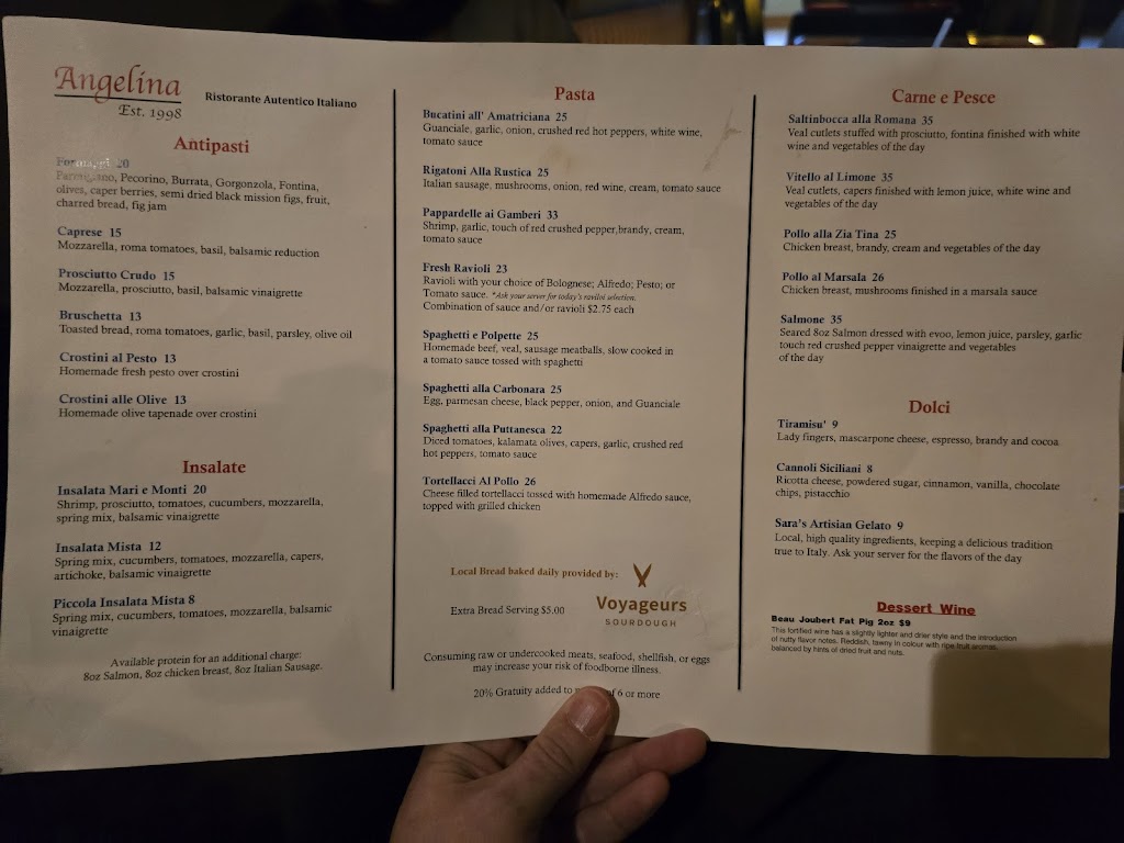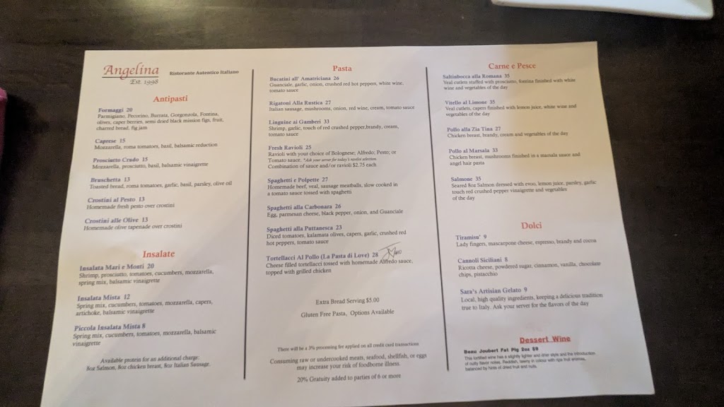 Have you been to Italy? Do you want to go to Italy but don't want to spend the upwards of 3k for two do do so? Then dine at Angelina. And dont oeder safe America style food. Try the pasta carbonara and know what its like to be in Rome. Have the caprese and experience Puglia. Order the cannoli and be in Naples. You might find a plac like Angelina in Chicago. Go ahead. Drive the 6 hours round trip. Or just go to Angelina. And if you're really Italian, there are things available that arenyon the menu. Lemoncello, grappa and espresso.