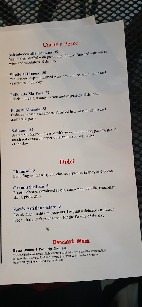 An insult to us Italians the food was horrible. They call that chicken Marsala more like Chinese food so sweet like they put sugar in it. The veal whatever they call it was not anything like Pacata. The worst was the Canoli . Don't waste your money .