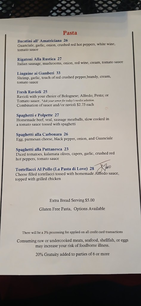 Had the Spaghetti alla Carbonara with gluten free pasta. Gluten free pasta was tasty. We got to the restaurant a few minutes before our reservation and were seated immediately. Waitress was very attentive.