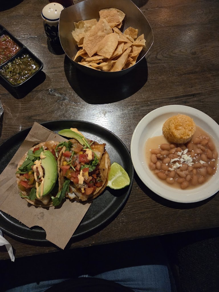 The atmosphere is great here! The staff are friendly and helpful. When you sit down, they bring chips and a dish of 2 different kinds of salsa and beans to dip them in. I ordered the fish tacos. They came with a side of beans and rice. They were sooo good! Prices were good for the quality of food. I will be back :)