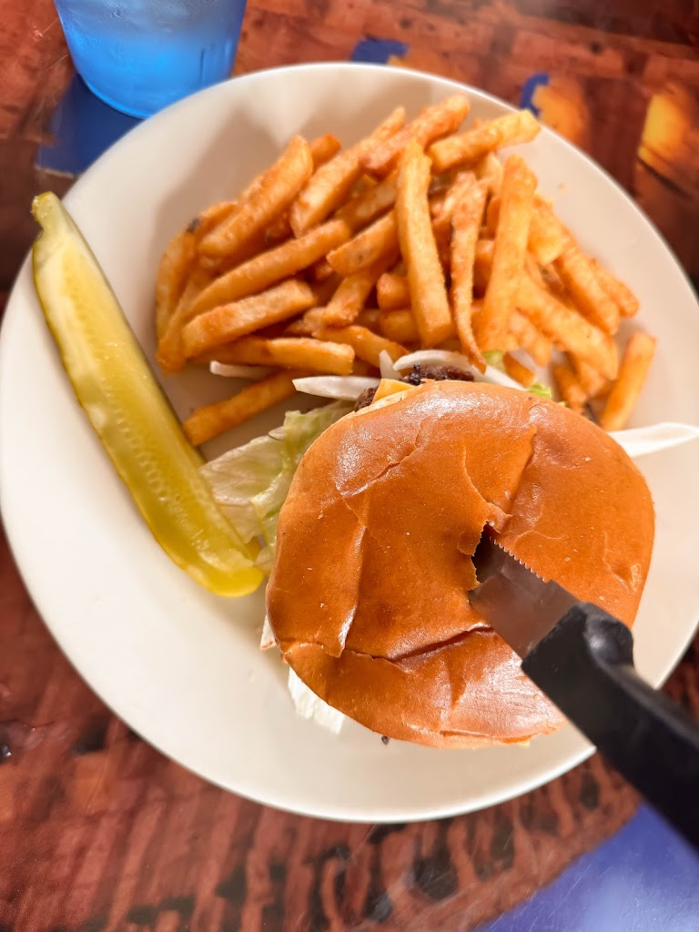 Melissa ordered the cheeseburger meal, which came with fries and a pickle. She said it was fantastic and was impressed by the size and flavor of the burger 🍔 — definitely a win on the lunch side of the menu.