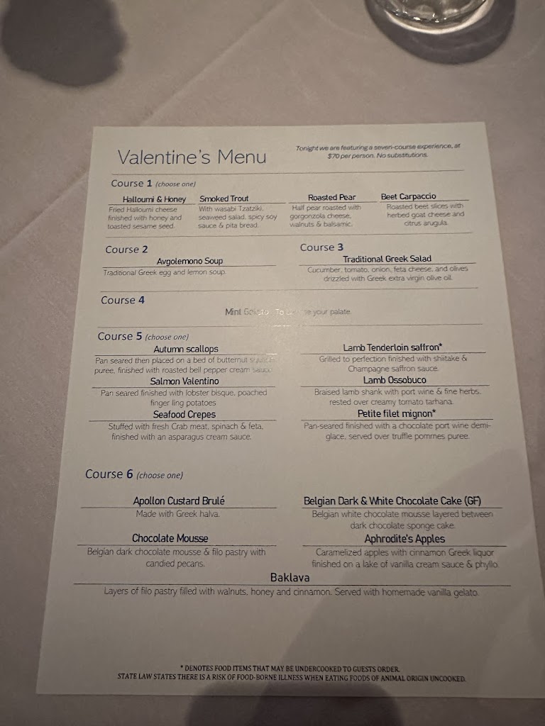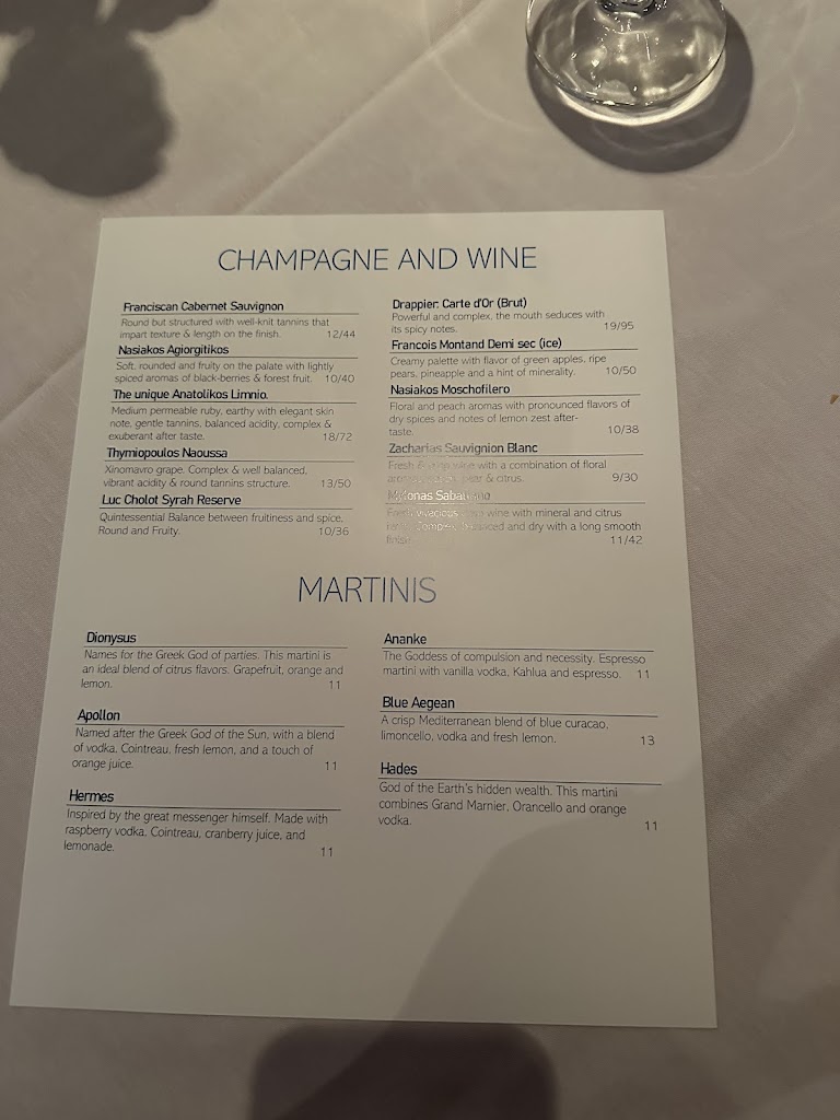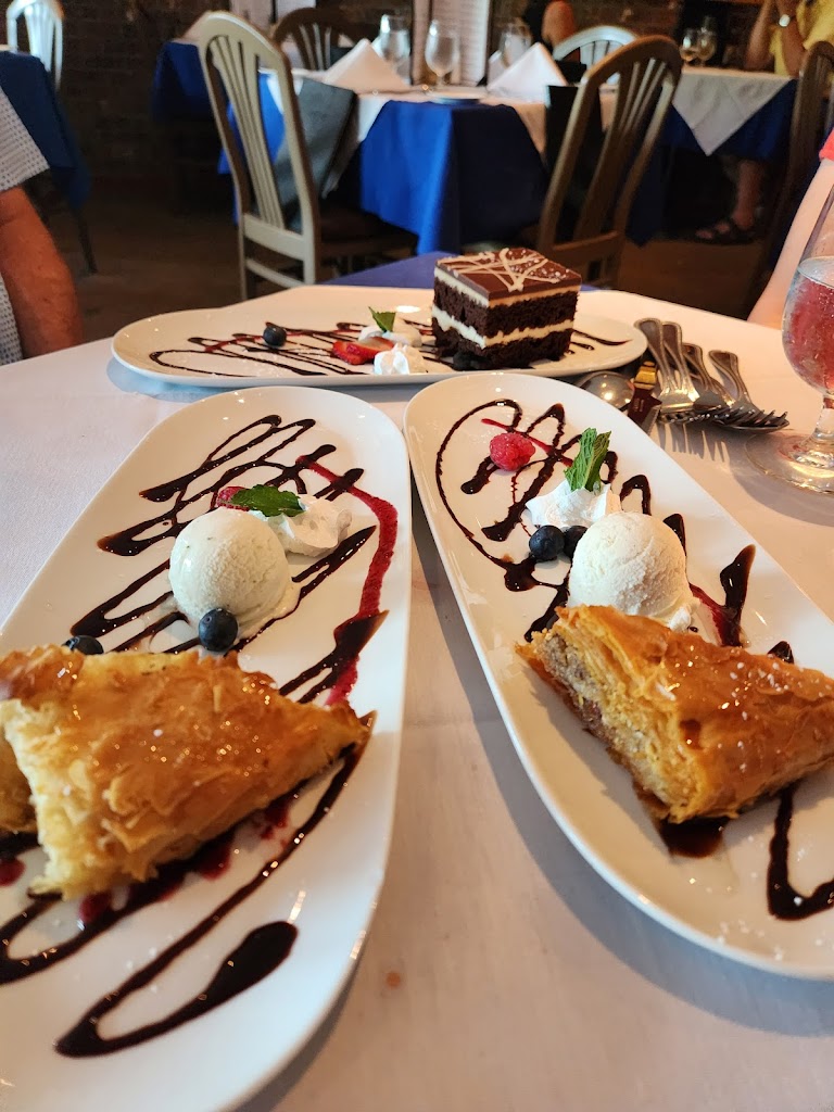We’ve been coming for years and every time it’s amazing. We had the Lamb Tenderloin and Shrimp Santorini, with the house Red wine & Mythos, lastly followed by the Baklava. Everything was delicious and our Server was amazing and so sweet.