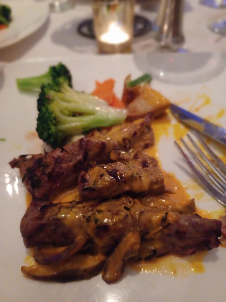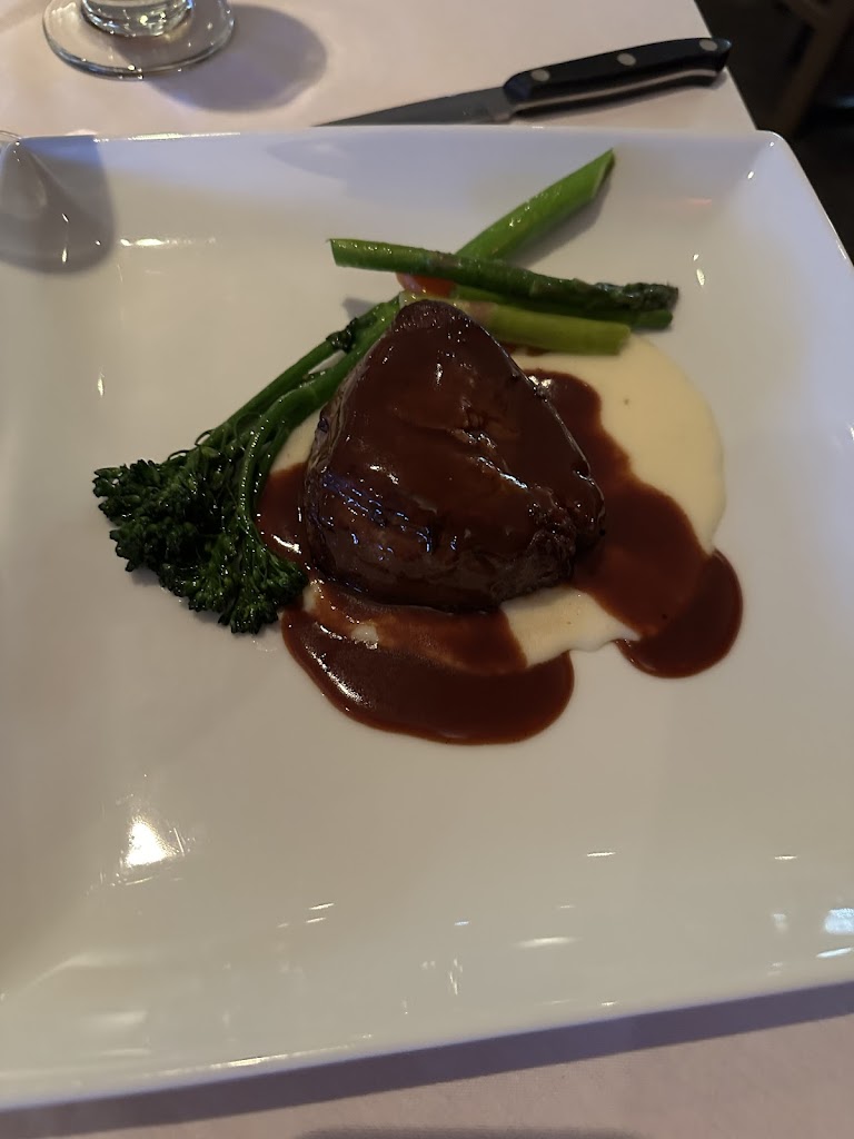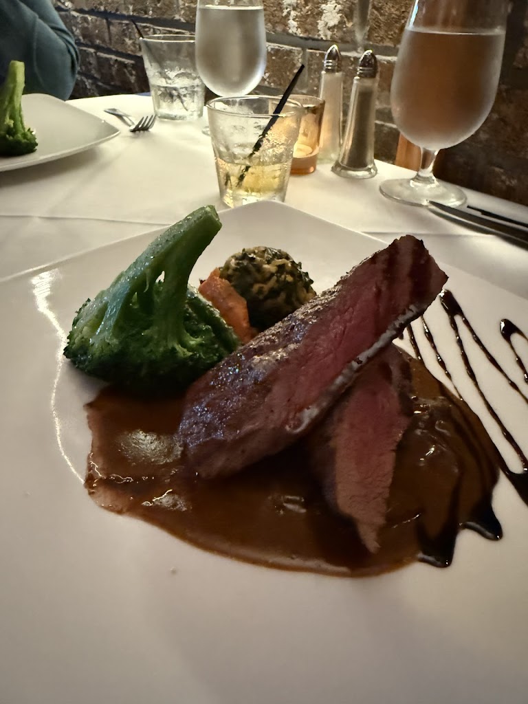 It's more of a "Special Occasion" restaurant (went on our anniversary). My husband had the mixed grille (lamb, scallops, and shrimp), and I had steak. We had the flaming cheese for appetizer and cheesecake for dessert. All was delicious!