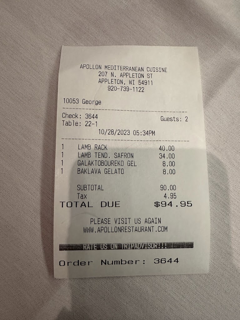 I would put Apollon on my “revisit” list next time I’m in town again because this was a top notch dinner and a lovely surprise to find this in downtown Appleton.