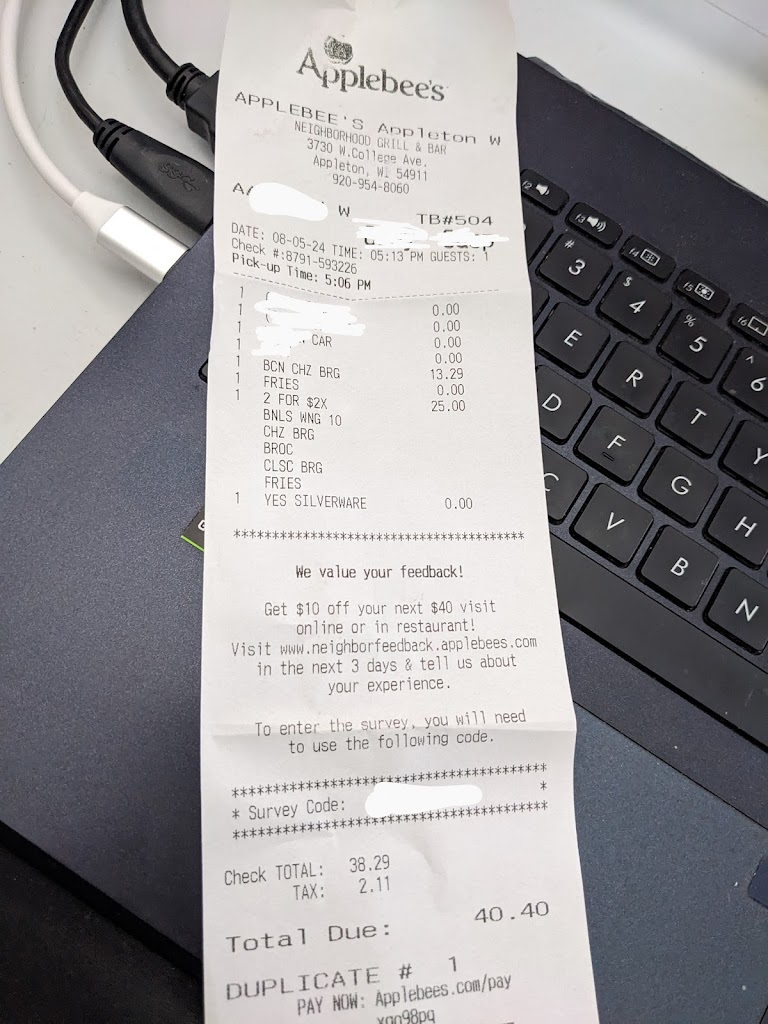 He was clearly new and overwhelmed, but at some point so many issues just aren’t okay. We won’t be returning and we hope the server is able to learn how to do this job better so as to not make dining out a genuinely annoying and unenjoyable experience. We also hope Applebees does a better job of offering appropriate training to servers who clearly are not ready or capable of doing that job.