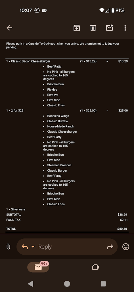 Order pickup, the order was ready quickly. The service was very friendly when I came in to pickup my order. The food was so tasty and the price was very fare . Ordered the $25 meal deal which includes 2 meals and a large appetizer to share. Really can't even get this amount of food at a fastfood restaurant for less, and Applebee's is so much better!