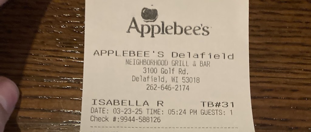 This is the best Applebee’s! The food is consistent, service is friendly and quick, and the restaurant is very clean. Hannah was our server and she was super attentive! She was always hustling, checking in with us multiple times, and ensuring our drinks were never empty. The food came out super quick and hot! Lucio the general manager stopped by to check in at our table. He runs an excellent restaurant and even refilled our drinks. Looking forward to visiting Applebee’s in Delafield again soon!