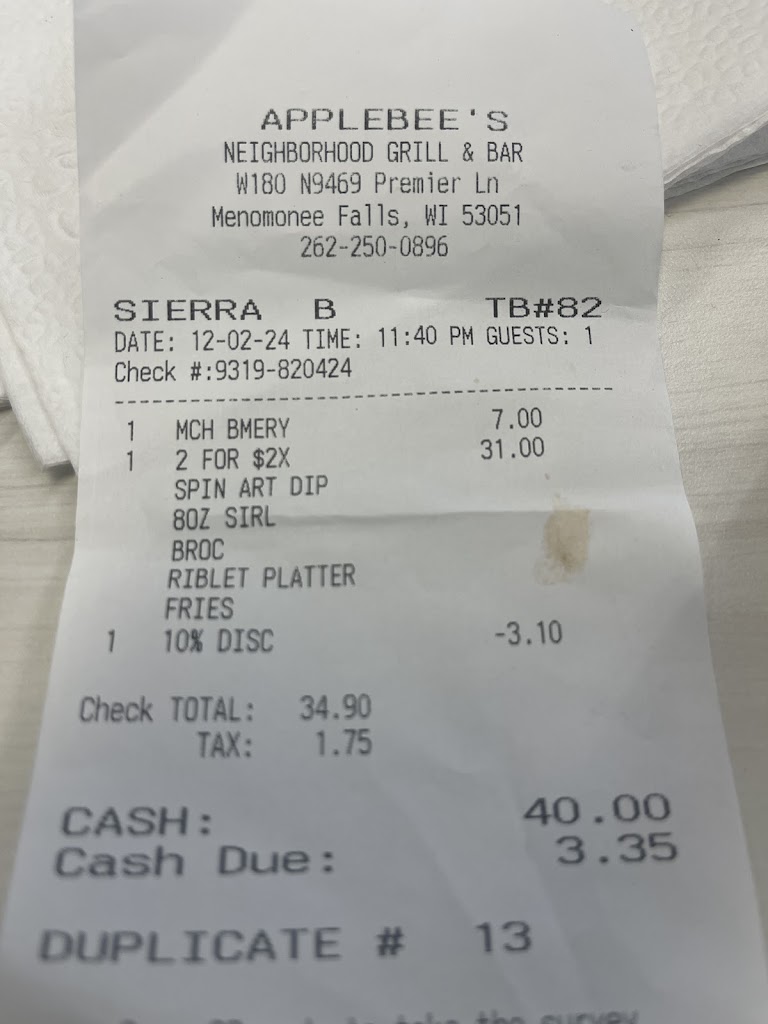 I’m not usually one to complain, but this experience fell well below the standard of service I’ve come to expect from Applebee’s. The rest of the Applebees crew tried their best and were kind and helpful but unfortunately that wasn’t enough due to the treatment from Stephanie and we won’t be returning in the future.