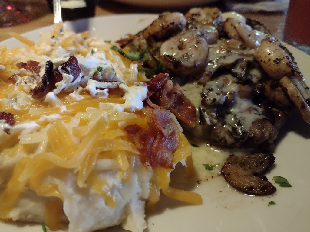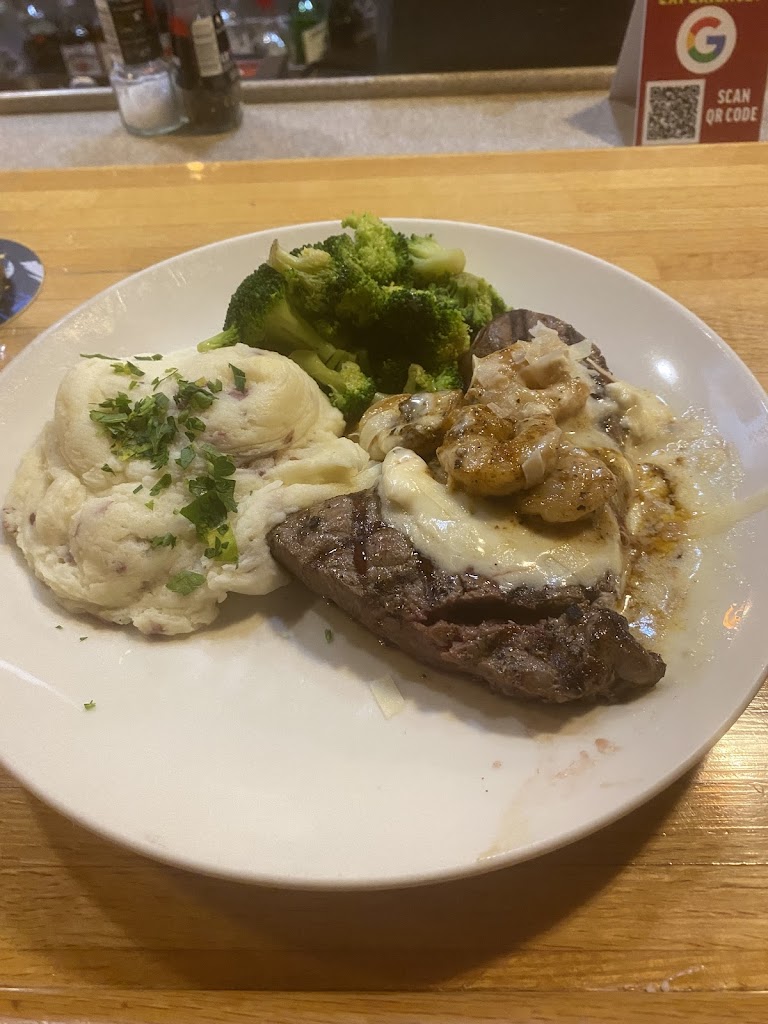 Came in after nine to take advantage of the half priced appetizers, Decided to go with the Parmesan shrimp topped steak with garlic, mashed potatoes and broccoli. The presentation of the plate wasn’t the greatest I’ve ever seen, but the taste made up for it. The steak was cooked perfectly. I had ordered it medium rare, and the seasoned broccoli was very tender, and the garlic mashed potatoes were garlic mashed potatoes, nothing real special there, I sat at the bar, because I was by myself . My server was friendly and helpful. It was overall a good experience and I would come back again.
