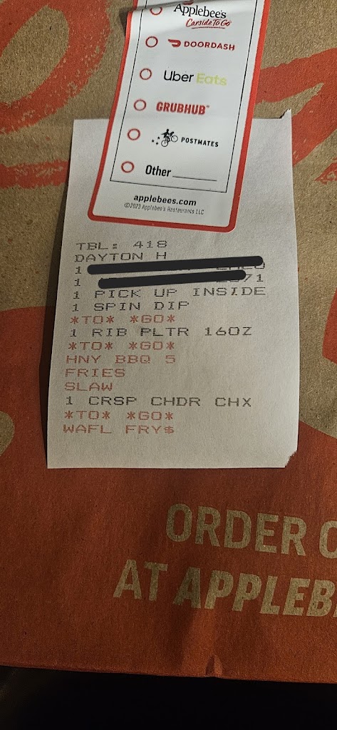 I often order takeout from this Applebees on UberEats and they just... cannot ever get my order right. The past five times I've ordered from this location, my order was wrong FOUR out of five times. They usually don't give the driver the drink I ordered, and this time they just gave me the completely wrong sides with my food altogether. There's a complete lack of quality control and it's getting increasingly frustrating.