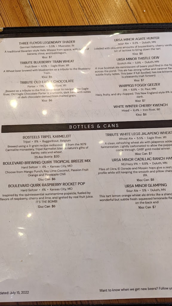 Boulder Junctions hidden gem!! This place is awesome. Great scratch made food. Great beer selection. Great atmosphere. If your looking for deep fried cheese curds and French fries. This isn’t your place. Refreshing to see how good food can be without deep fried foods. Owners are killing it here. If your any where around the area or not it’s worth the travel to come eat and drink at IMO the best restaurant in the north woods!!
