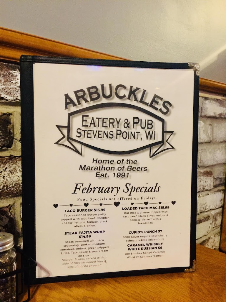 Arbuckles Eatery & Pub, located in a historic 1894 building, has been a beloved part of Stevens Point since 1991. Originally an eatery, it expanded to include a bar in 1999 and a smoke-free patio in 2009. Known for its famous Italian fries, specialty pizzas, and wide range of beers on tap, Arbuckles offers a welcoming atmosphere for all. There is no denying that Wisconsin is famous for having excellent brews. We celebrate the quality of beer crafting by offering a fun, challenging, and rewarding customer loyalty program called the “Marathon of Beers.” Family-owned-and-operated, it prides itself on excellent service and strong community ties. Join us to enjoy great food, refreshing drinks, and a piece of local history.