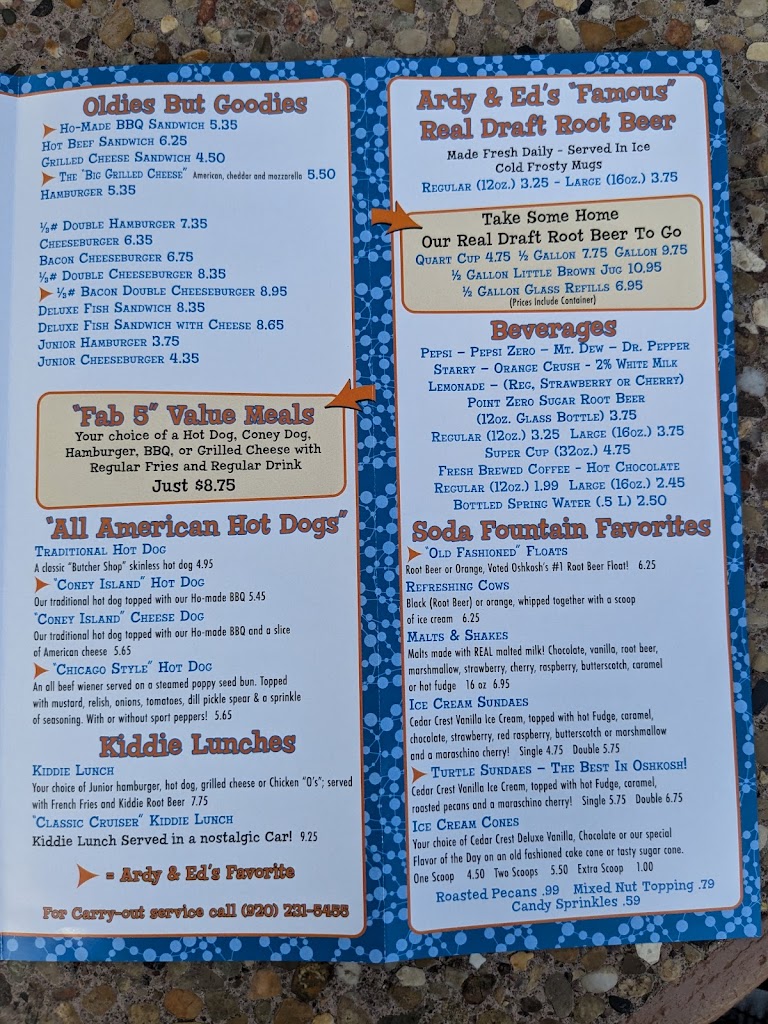 Ardy & Ed's serves up big frosty mugs of creamy, Real Draft Root Beer, old-fashioned soda fountain favorites, and fabulous food! Plus, you can find nostalgic souvenirs and clothing items to take home and enjoy. Ardy & Ed's is located on Oshkosh's south side, across from a public boat landing & park on beautiful Lake Winnebago.
