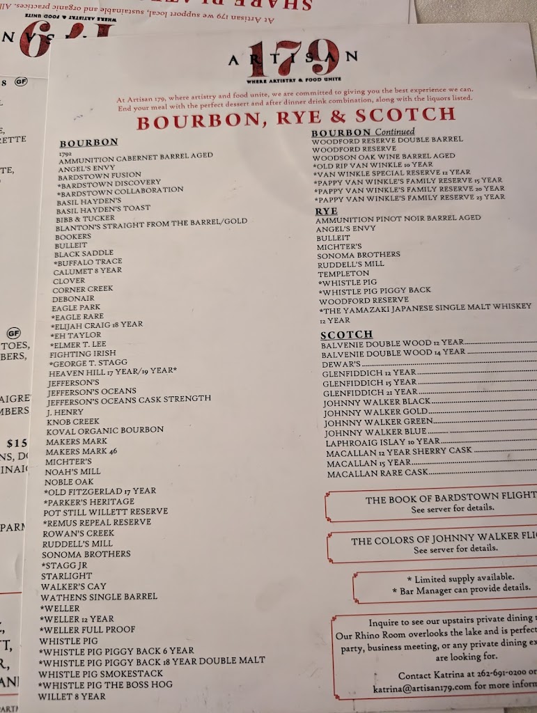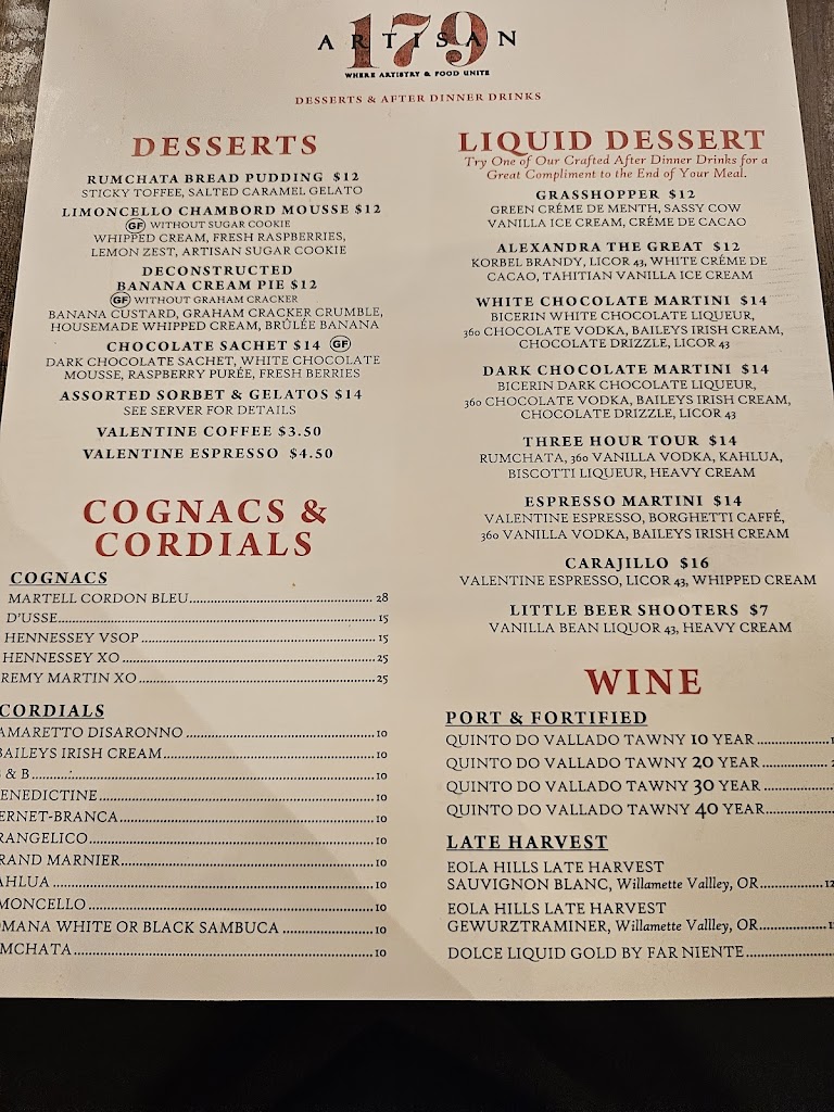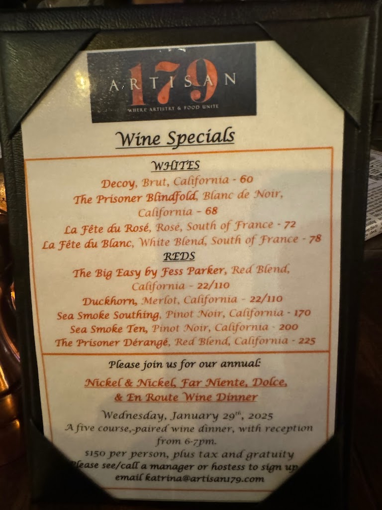 I cannot express the incredible service we experienced. We had originally planned to celebrate our anniversary the day after, but last minute, we decided to actually go out. I called ahead and made a reservation, then had to call again to adjust it to later. Artisan 179 were beyond accommodating and even put together an anniversary treat and card together to celebrate our day. It truly made our night for such a hectic time. Thank you! Your kindness and service were outstanding.
