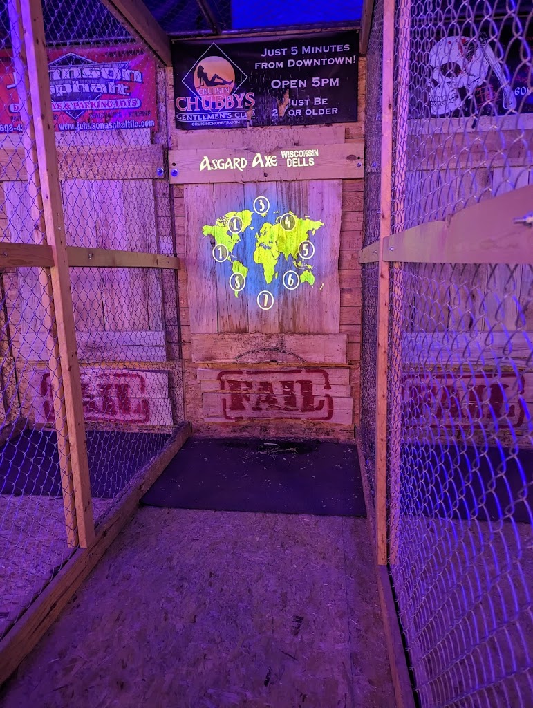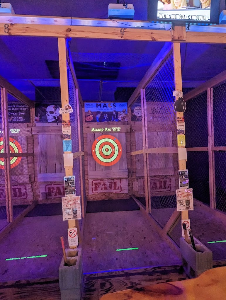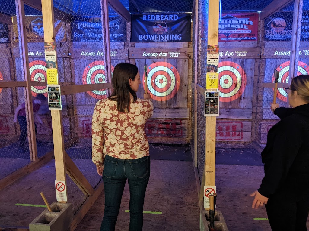 This place was awesome. We did not partake in the axe throwing upstairs, but was brought there by the “Underground Arcade.” (3) rooms of both old and new arcade games, maybe + 50 different machines. Played on an ALL-DAY pass for $20 per person. Stayed about 3 hours and my kids and wife LOVED it. Found this place online for things to do. Did not eat there so couldn’t comment but seeing others food, looked good. Our bartender (Tom) was GREAT. He knew about the beers that I asked about and walked me through all that I needed to know. I would say if your looking for something a little different in Wisconsin Dells, or need something on a rainy day, THIS IS THE PLACE! Thanks for having a cool concept bar and for the great service. Btw, drinks were very reasonably priced too. When we come back, we will be visiting again!!!