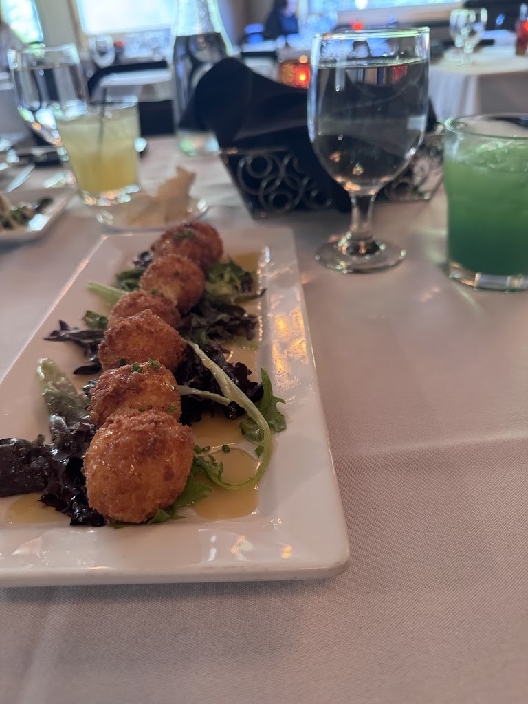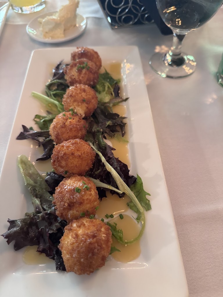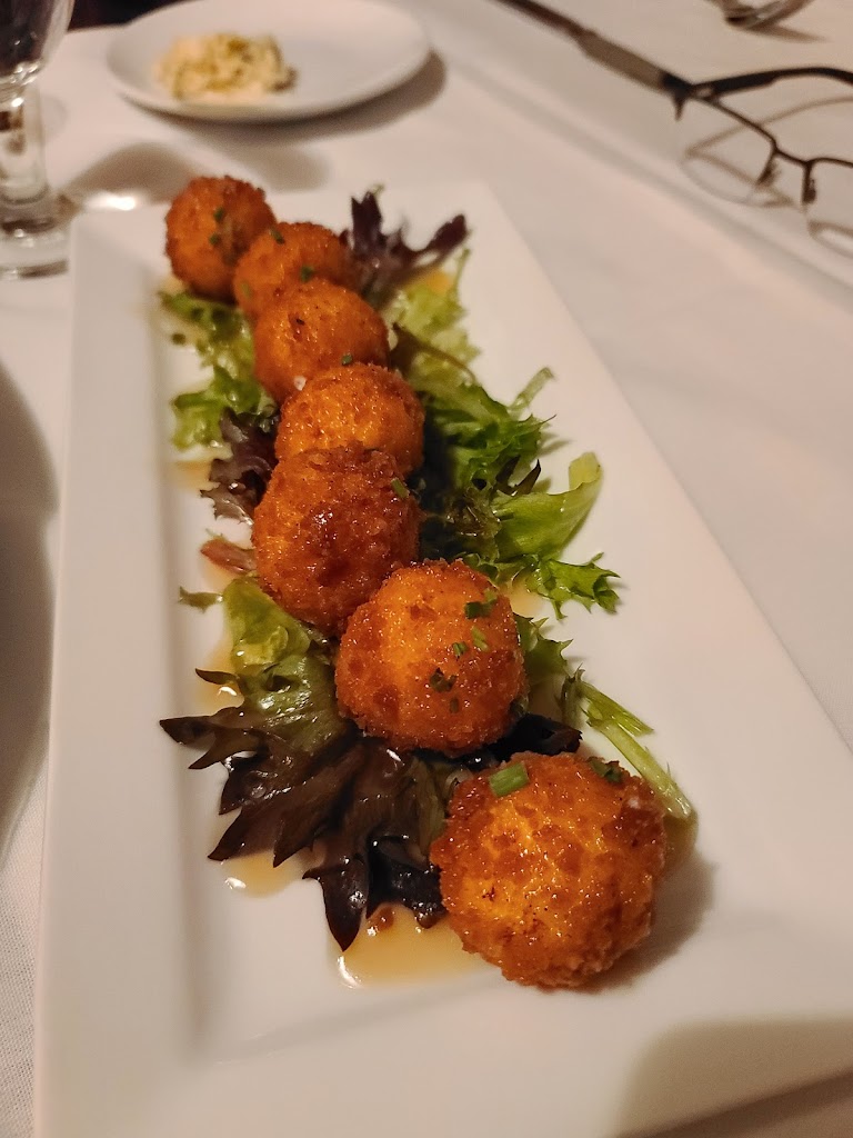 The goat cheese balls were light, crispy, golden brown. Served on a bed of mixed greens with a creamy honey lightly drizzled. The crunchiness of the outside was complimented by the sweetness of the honey and the gentle sharpness of the soft goat cheese is just magic!