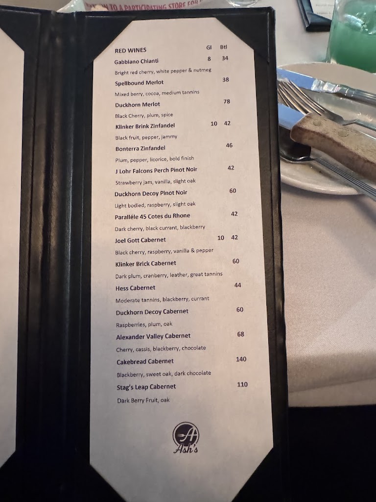 We went to Ash’s for the wine tasting special event tonight. It was AMAZING. The staff is so very friendly & fun & the food was wonderful. The only complaint I have is that the mens bathroom has fun signs & the woman’s doesn’t (women like fun signs too 😆). We had a spectacular night and will definitely be back. 10 stars!